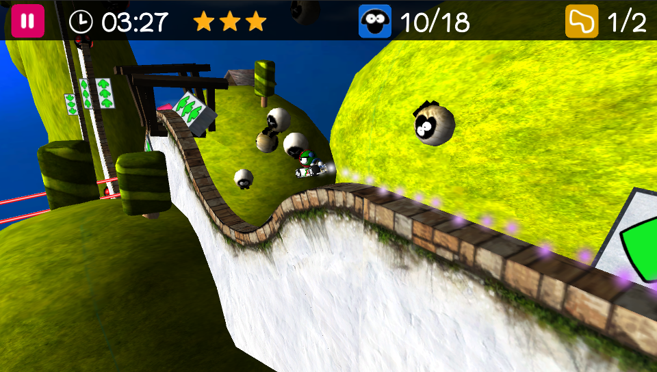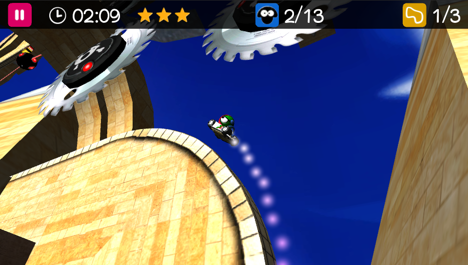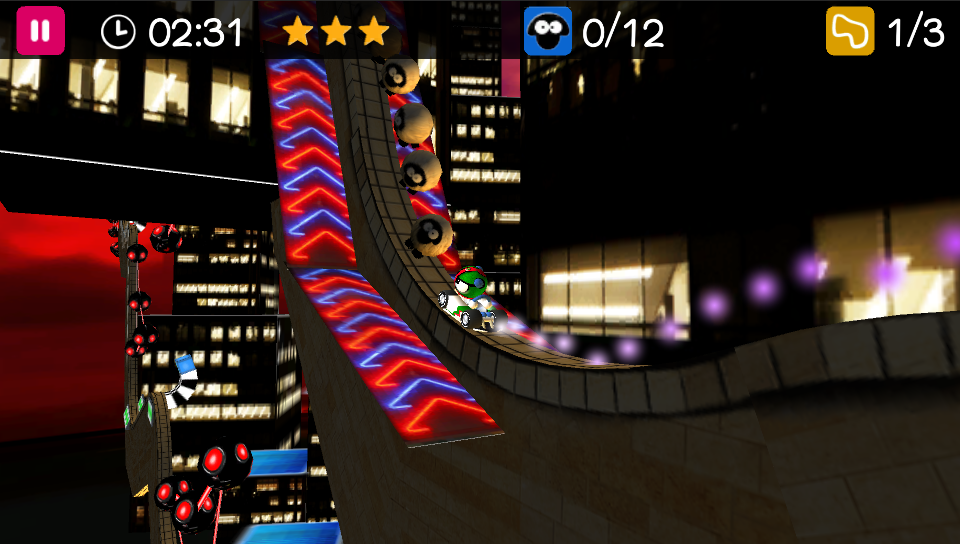 Back to the tracks and while there are no other cars to race against, each has a set time limit in which they have to be completed. There are three time goals set at the start and the faster you complete the track the more stars you earn up to a maximum of three. Complete all five main tracks in each world with two stars each (or three tracks with the maximum three stars) and you unlock the sixth and final bonus track. Unlike other challenge-based racers, there’s no particular order in which you have to tackle each of the worlds as they are all available from the start although the tracks themselves need to be played through in order. In addition to the extra tracks, the game starts you off with a choice of two different karts (although the only difference between the two appears to be cosmetic) but a further six are available to unlock throughout play.