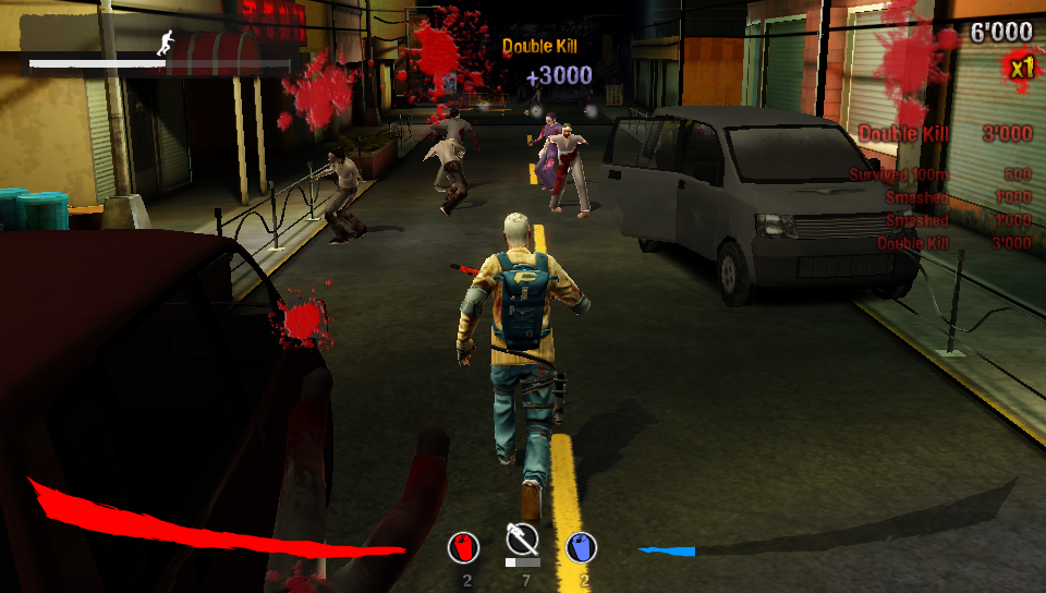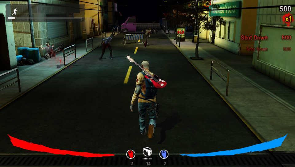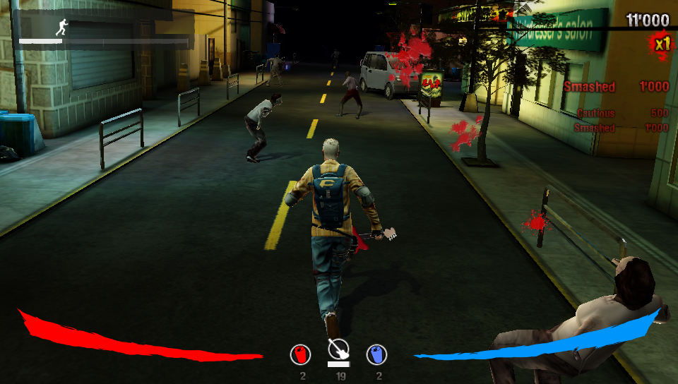 It’s not just a case of constant running with zombies in hot pursuit as you might expect from an endless runner though. Instead, the mindless assailants are coming towards you head-on and you’ve got no choice but to make your way past them without being beaten, bitten, gnawed at and generally becoming the next main course at the zombie restaurant. It’s not simply a case of running as best as you can avoiding the zombie menace as not even the toughest outcast from The Walking Dead would stand much of a chance against the hordes that you’re faced with here. Instead you do have a few tricks up your sleeve to help you along the way. As well as controlling your movement with the left analogue stick, you can jump over obstacles in your way, slide to duck under objects (which can also be used as a sliding attack), attack zombies with a well placed knee to the head, and even pick up melee weapons to use against them (and in later stages even firearms).
