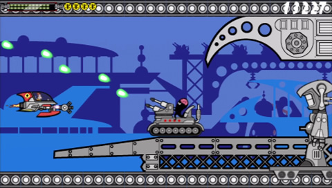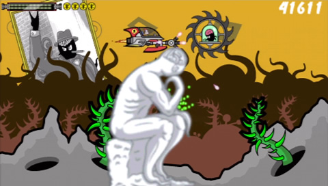 Then there are the graphics. While they work well and the cartoon style fits the game’s humour perfectly, it does present some problems. Multiple layers of scrolling add depth to a game and can enhance visuals significantly… when done properly but here they become a hinderance. I mentioned Scramble earlier for a reason. Part of the background in the game in indestructible and contact with it will cause your ship to explode. This in itself wouldn’t be a problem but there are times when an additional layer of graphics scrolls past in front of the main game screen blocking your view of the playing field. It only obscures your view for a moment, but in that time it’s easy for you to have collided with the background, an alien craft or a missile that they have fired at you.