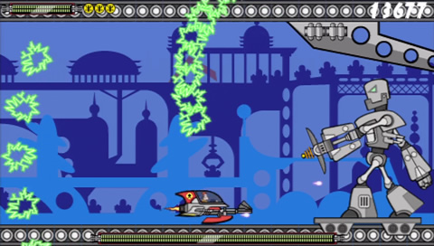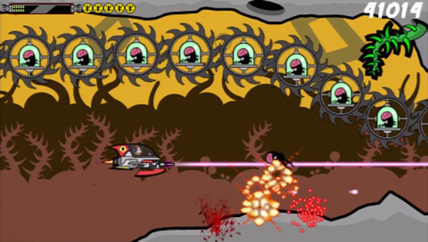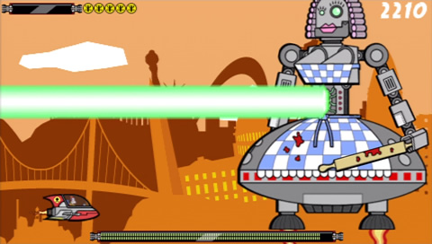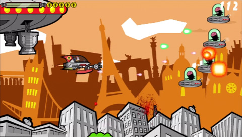 You have little more that a trusty laser mounted on your ship, although you are aided by a Recycl-o-Ray that is conveniently fitted to your craft. As you destroy the oncomming aliens, you can use this ray to extract essence from their remains and use it to create more powerful weapons to use against them although its use is temporary until you run out of essence (so keep using the ray to top it up or it’s back to your plain old laser!). In a nutshell, that’s it – blast your way through each level, take on each boss and turn their weapons against them, all set against cartoon backdrops, with nicely animated graphics displaying a somewhat quirkly sense of humour from the developers.