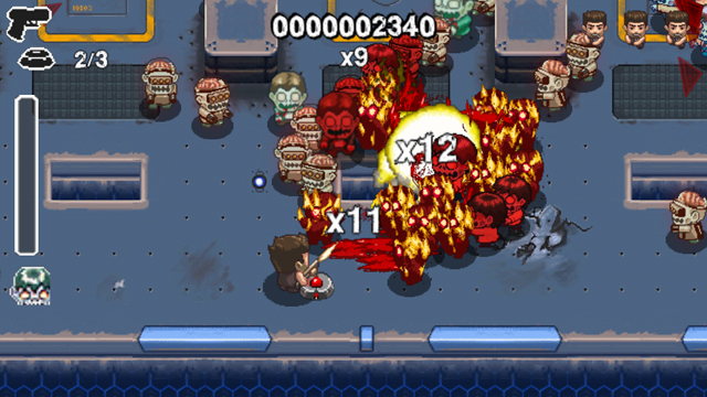 Controls are very simple and explained at the start of the game, the D-pad/left analogue stick moves Barry around and the action buttons dictate the direction Barry shoots in or you can use the Right shoulder button to fire in the direction Barry is facing in, your secondary weapon is deployed using the Left shoulder button. The controls are simple and they need to be in order to cope with the wave after wave of zombies that start to fill your screen.