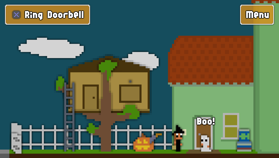 5.Take Fishing Monthly to the girl’s father to get the x-mas lights for the robot costume. Then make the robot costume and the bandit costume. Trick or treat once again in the three different houses and once again take the candy to the candy bowl. Finally, take the rubber bat from the hook off the girl’s house and then hang it in the tree house. When you press ‘point to rubber bat’ the boy in the tree house would get scared, leaving the candy and running away. Take the final piece of candy to the candy bowl, and the game is complete!