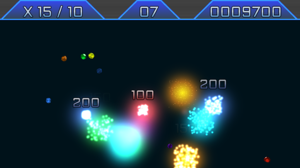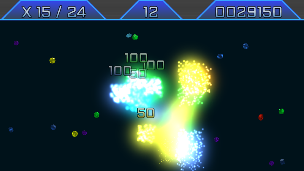 The concept is incredibly simple and at first glance Chain Reaction looks like it’s quite a bland game. You’re presented with a black screen with small coloured gems moving around the screen and what you have to do is tap one of them to detonate it. If any other gems get close to that explosion, then the game springs to live in a technicolour explosion and as more come into contact with that explosion the screen fills with a vast chain reaction (hence the game’s title) of exploding gems. The idea behind each level is to detonate a target number of gems so you can progress onto the next, tougher level… but as you would expect there’s a catch as you only have one attempt and you can only set off a single gem on each level so you have to watch the movement of all the gems and choose very carefully and get your timing absolutely right.