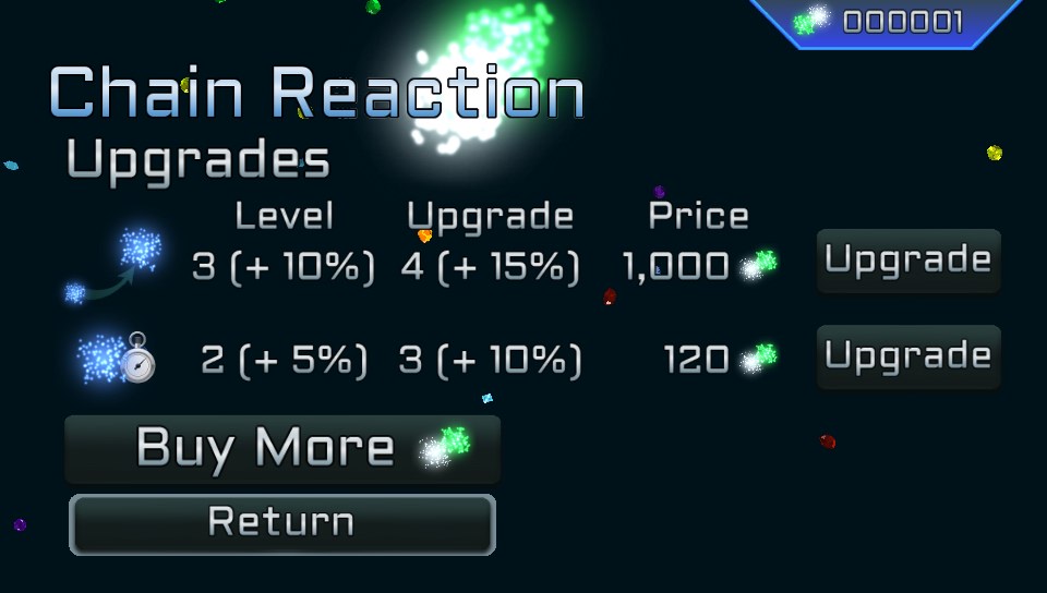 And that’s because Chain Reaction has been released under the Free To Play model and while you can play the game quite happily and progress through the levels without having to pay anything, the game features microtransactions offering additional Chain Points that can be purchased in-game. This is where my real gripe is with the game. Once you’ve progressed from the first level in terms of upgrades, collecting Chain Points can be a slow and arduous task earning a single point for every 1,000 points you score during gameplay, but each upgrade costs an incredible amount of points. While the initial upgrades from Level 1 to Level 2 cost a total of 22 points for the two different upgrades on offer, to upgrade both to level 3 requires well over 200 Chain Points meaning that you would need to have notched up a cumulative score of over 200,000 points.