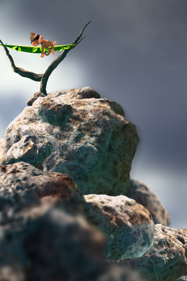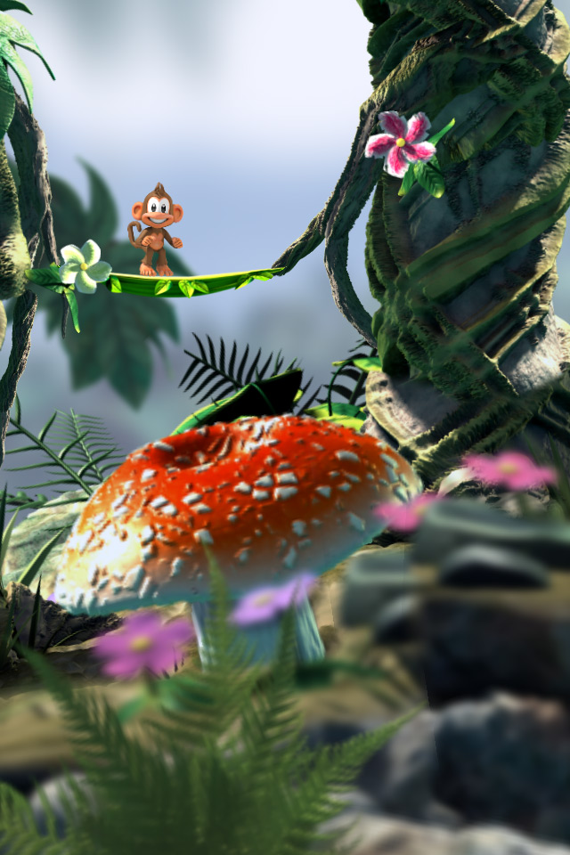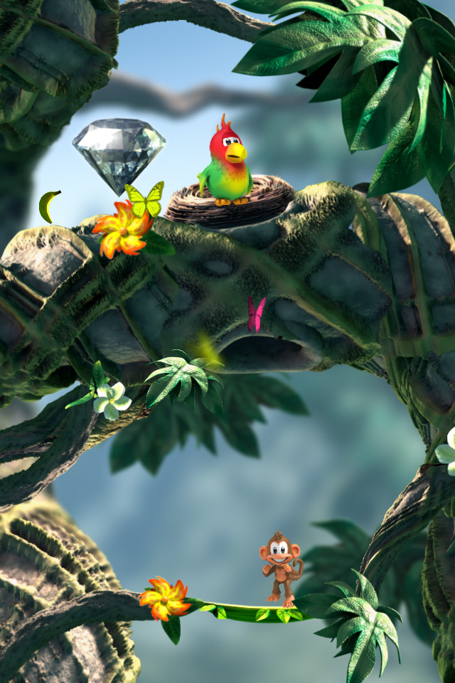 Visually this is arguably the best looking game on PlayStation Mobile to-date. The graphical style is reminiscent of Donkey Kong Country on the SNES with absoloutely stunning CGI rendered backgrounds and characters that are beautifully animated. The backgrounds are richly populated with flora and fauna and are brought to life magnificently, added to by wonderful ambient sound effects that make the game a delight to look at and listen to. The animation on Chuck himself just adds to this. He is full of expression and character and whether he is waiting for you to do something, has just collected a bunch of bananas (I’ll let you experience this one for yourselves) or reached the treehouses when he gets home, I defy anyone who won’t raise a smile or two.