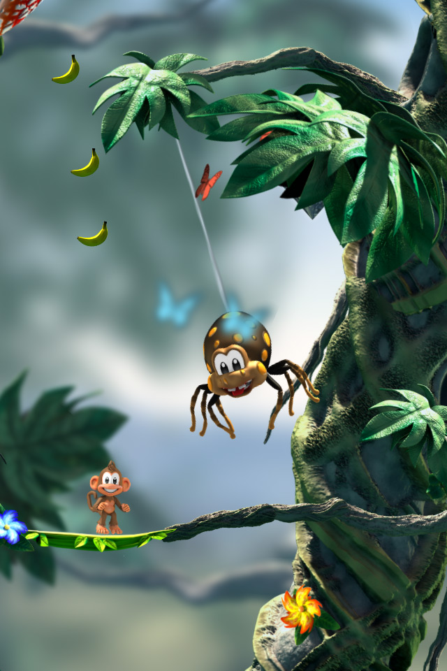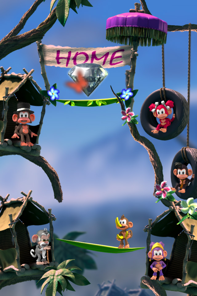 You take control of our hero, Chuck the chimp, who has to make his way through the dense jungle, using extremely pliable and somewhat rubbery vines, to springboard him further upwards into the trees (strangely this is one ape who has a reluctance to jump and climb like his peers), until he makes it to his home at the top where his family wait for him… in their treehouses. Yes, Chuck isn’t your normal chimp and it’s not your typical jungle but you weren’t honestly expecting realism were you?