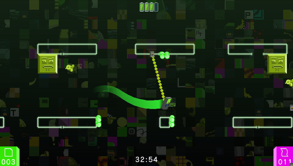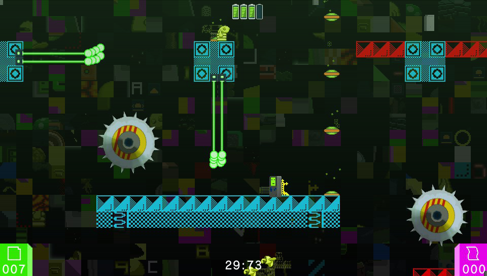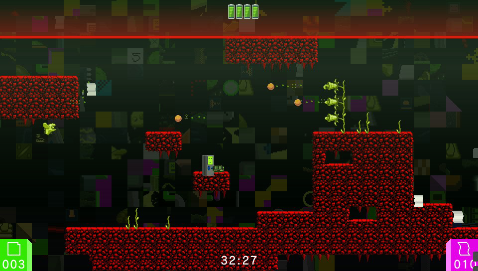 In addition to the main part of the game collecting the cartridges and reaching each exit, there is a clock running on screen throughout. While each level isn’t a race to complete it against a time limit, your time is recorded and displayed once the level is completed. In addition, there are bonus code “pages” scattered throughout the level for you to try to collect. Some are easier to reach than others and while they don’t offer any bonuses to the game itself, they do provide an extra challenge for ther most hardened gamers.