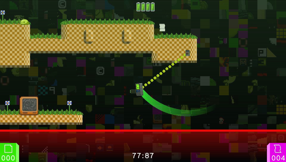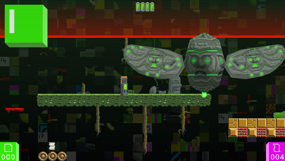 So off you set determined to save retro gaming for ever. What follows is a platform action game spread over 16 levels. You start out in the main level selection area where you’re presented with a number of video screens, each representing a different level in the game. Once near these, pressing triangle will enter the level (assuming it’s one you have already unlocked by completing the one before it) and then once in the level proper you’re tasked with finding a set number of game cartridges and then making your way to the level’s exit, again represented by a video screen. Along the way, various creatures are out to stop you although these can be despatched with your trusty blaster (doesn’t every handheld console come equipped with one these days?) and to get to those hard to reach platforms, you’ve got some help at hand by way of a grappling rope that you can make use of constructed from retro energy. It’s not a lot but it could just be enough to help you save the day!