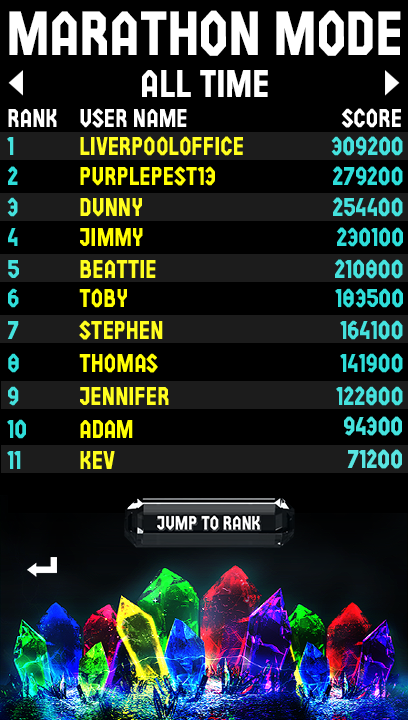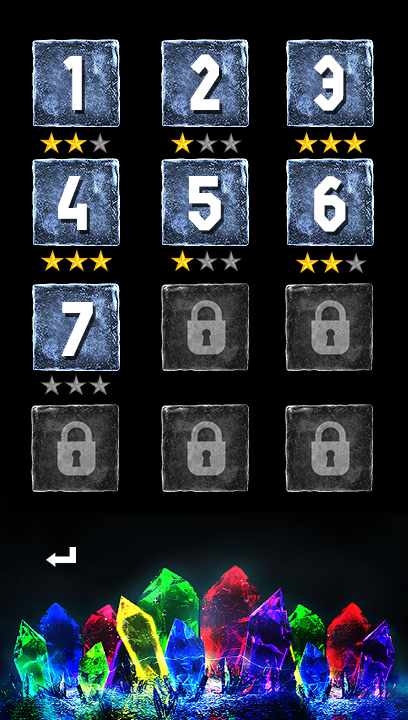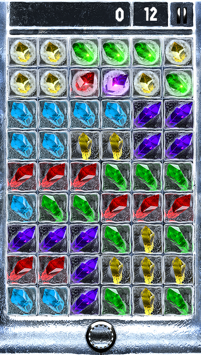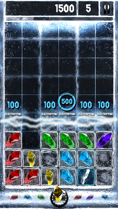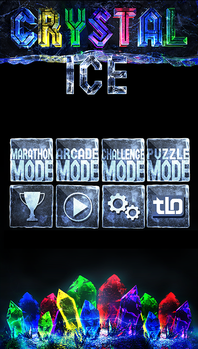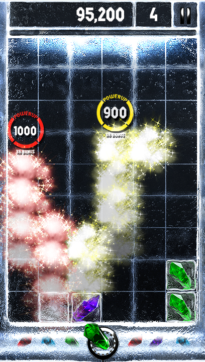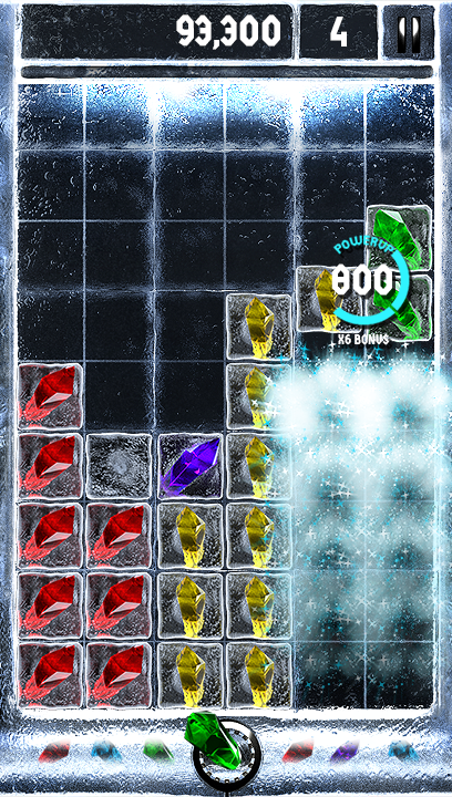 Marathon mode is the main thrust of the game.At the bottom of the screen is a row of crystals. Using the touch screen these can be dragged individually onto the main play area onto any of the empty ice blocks that are on the screen. These fall down from the top of the screen gradually as you play at random across the screen and need to be removed before they reach the top of the screen. To remove them you need to arrange three or more of the same coloured crystals together – vertically, horizontally or in any block and then tap on that group. The crystals and blocks of ice beneath them will shatter and all of the cubes in the column above them will drop moving any crystals down with them.
