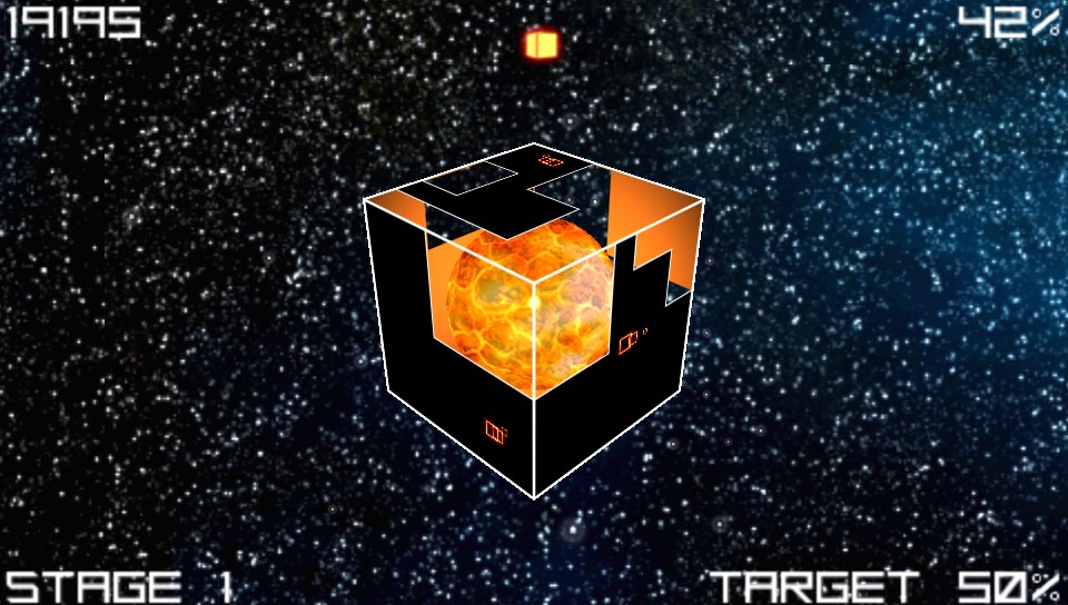 As areas are sectioned off, they are removed to reveal energy (Laughing Jackal’s description, not mine!) at the centre and once enough of the cube is removed, this energy explodes (why, I have no idea) and you then move onto the next stage. One thing I thought was a nice touch was how they overcame obvious problem you were going to encounter if you removed all of the surrounding cube surface in the centre of one of its faces… simply that isolated panel moves to one of the edges of the cube and re-attaches itself. Simple but it works extremely well in play.