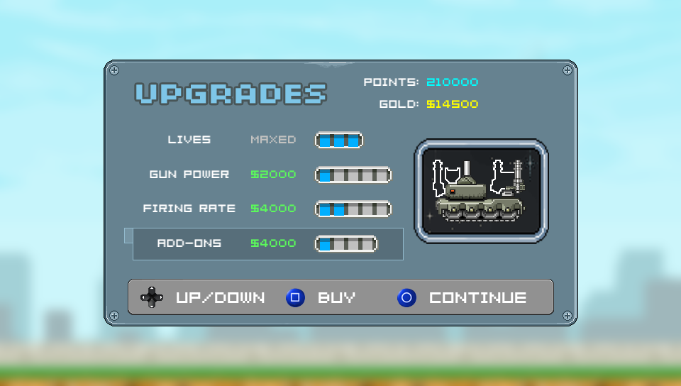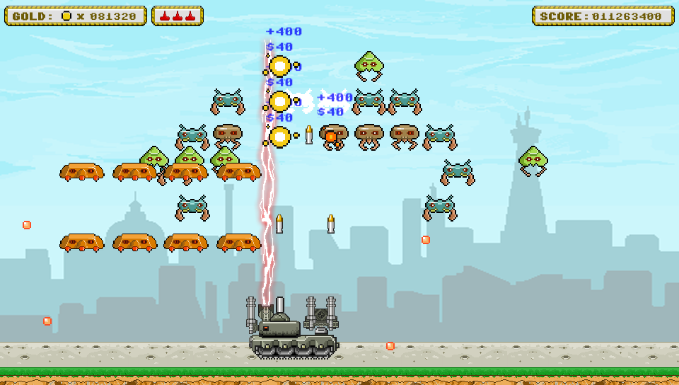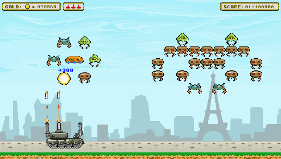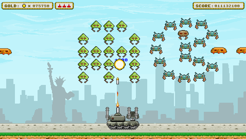 From herein the game begins to show it’s diversity from the tried and trusted format. As well as scoring points for each alien you destroy, each one is worth a set amount of money and this can be spent in a shop that you visit between each of the games 50 levels. Here you can purchase extra lives or a range of power ups for your tank which including adding on new weaponry, upgrading existing guns you already have or increasing the rate of fire of your weapons allowing you to shoot more frequently. Once you’re happy with your spending spree (or if you decide to save your hard-earned cash) simply leave the store and carry on to the next level to see what devastation you can unleash…