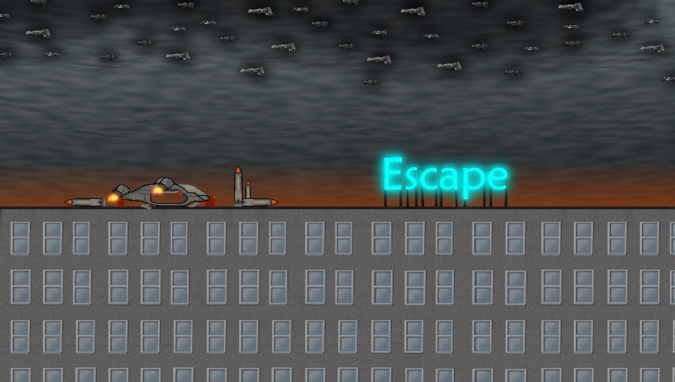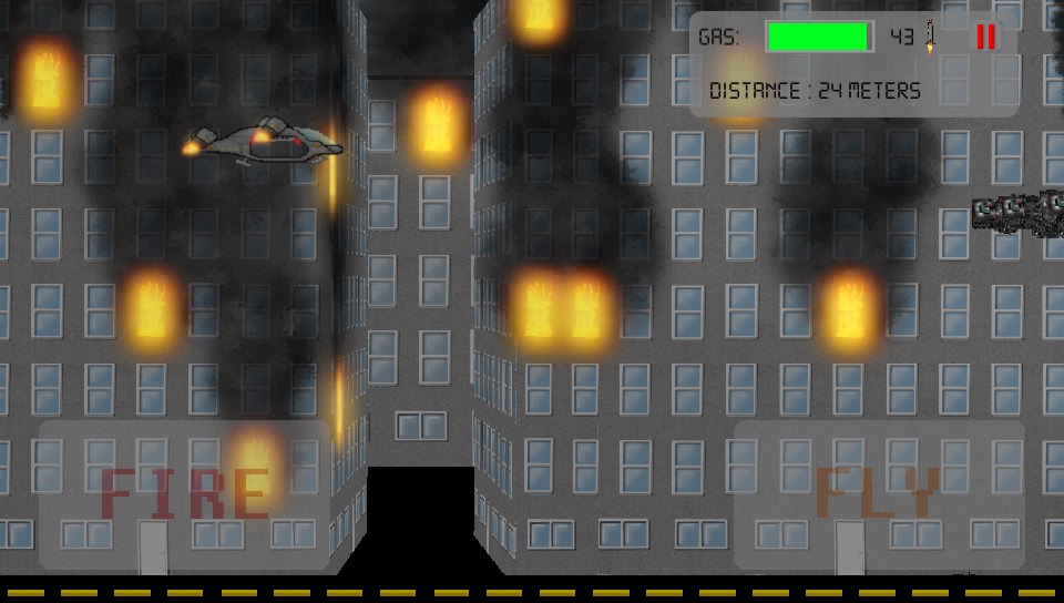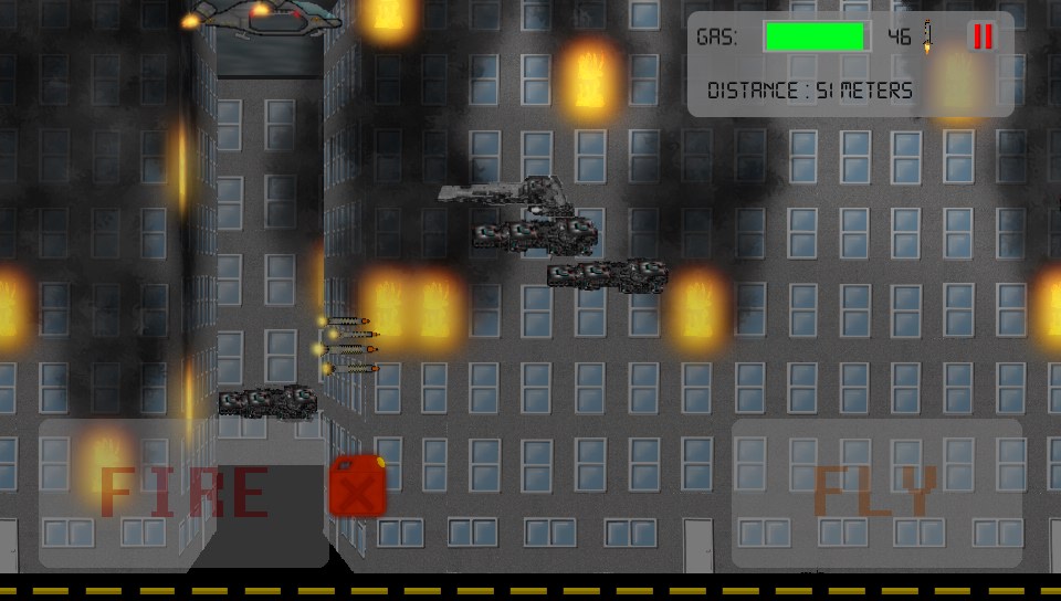 Set in a futuristic city that has been ravaged by an alien invasion, your only means of escape to safety is a small aircraft with limited firepower and an even more limited fuel supply. The remains of the city are in flames behind you, waves of invading aliens are still coming towards you… all you can do is keep flying as far as you can to escape to safety. Hidden behind this extremely limp plot is essentially a variant on Helicopter with a few alterations to some of the basic mechanics. Rather than being set in a never-ending cave, the landscape takes an open plan approach with the cityscape scrolling past in the background throughout as you play.