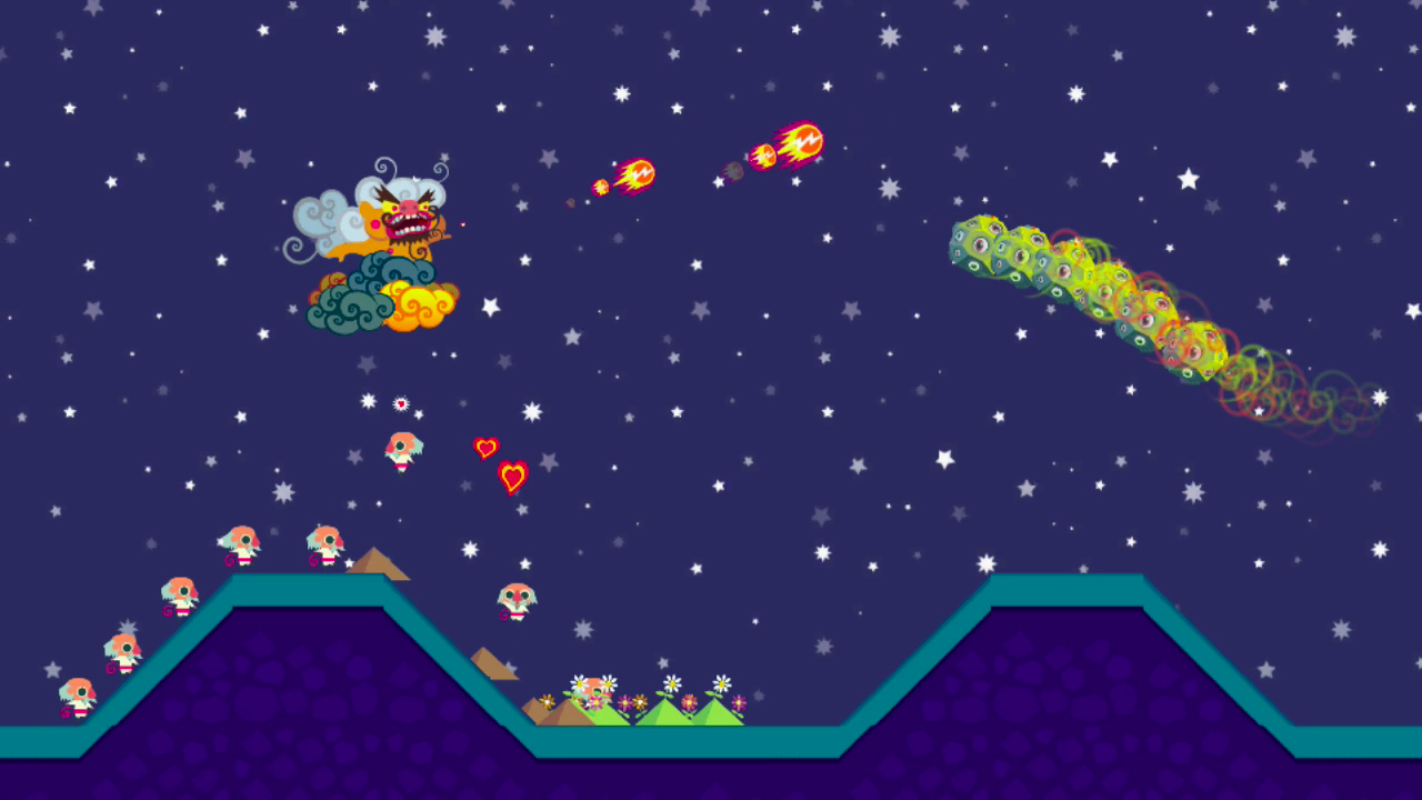 There are seven worlds set amongst backdrops such as a clear bright blue sky; the night sky; hills with trees; snow capped mountains; and various other beautiful environments. There are two things that every one of the seven worlds has in common and they are that all of the enemies will be trying to kill or capture the pilgrims and there is a boss at the end of each world. The end world bosses range in their size and frame, but they all fire projectiles or make them rain from the sky to attempt to kill you and the pilgrims you are attempting to protect, so the end world bosses can be quite hard, despite actually remaining very enjoyable to play.