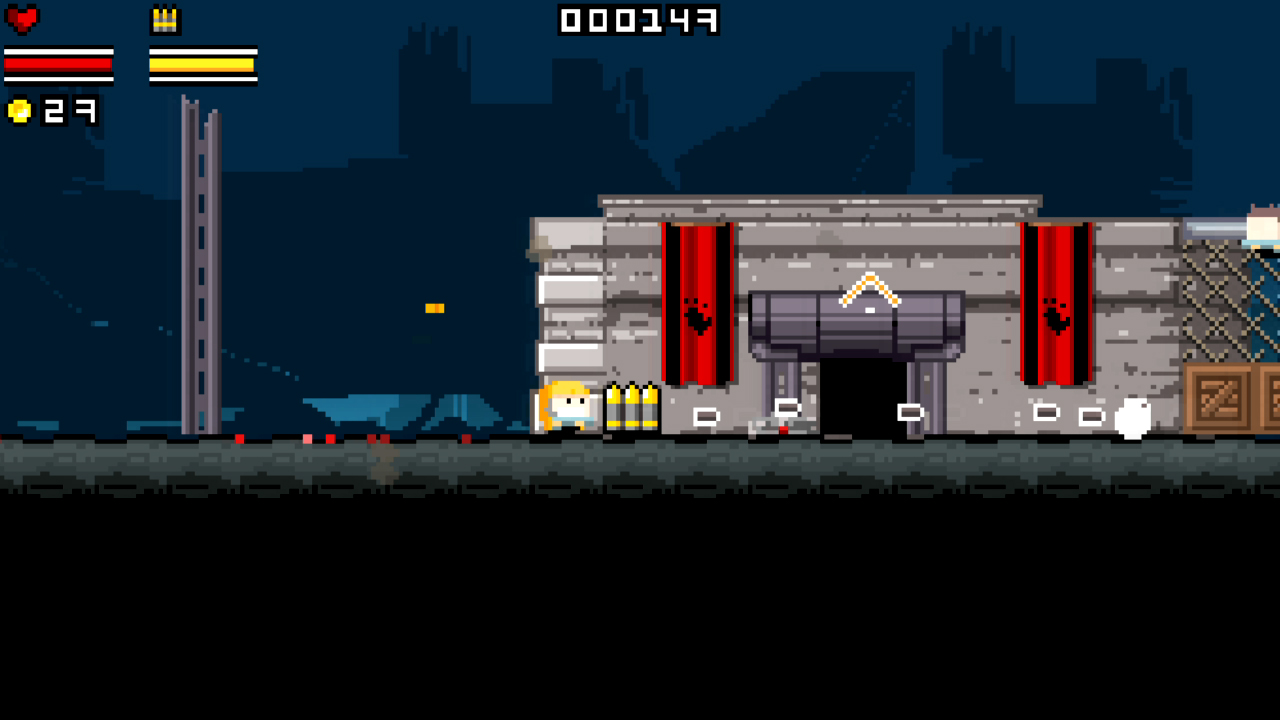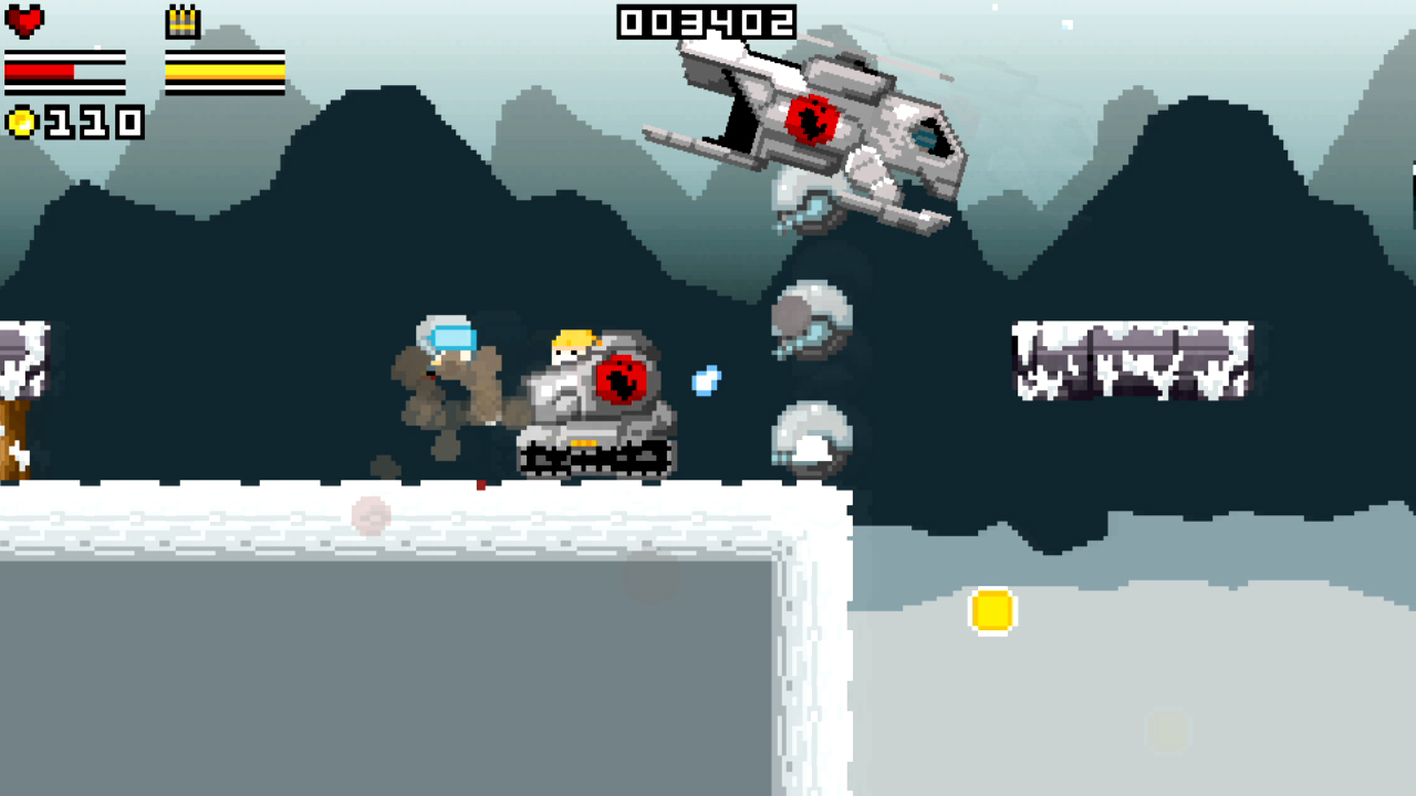 Gunslugs is a side scrolling shooter that takes its influence from the ever popular Metal Slug series. From the start you are asked to pick from 2 commandos available and set forth to destroy all in your path. You battle through 5 main missions that consist of 2 levels and a boss level. Very simplistic so far. These missions cover a range of different environments and completing levels is a task of destroying key enemy installations by entering them and blowing them up one at a time once the installations are destroyed you then need to reach the end of the level for a pick up and parachute into the next mission. Each level contains the bog standard cannon fodder enemies as well as some level specific enemies that may come at you with specific weapons, such as flamethrowers or jetpacks, and while you start out with a fairly standard weapon you can acquire these same weapons from downed foes, most offer differing ranges and rates of fire rather than power upgrade. This offers a small nugget of strategy as you are able to take enemies out at a distance or from differing ledges. Your enemies will also drop coins for you and while these look like stowaway’s from a Super Mario game they are useful for purchasing a range of upgrades and taking advantage of small mini games that you will find inside bunkers that periodically appear throughout the levels. Some upgrades offer armour or extra ammo. Others offer full health regeneration or an extra continue if you have been particularly frugal. There is also a checkpoint system of sorts as near the beginning of each mission there is a captured ally who you can choose to save by shooting their cage. Saving these allies offers you the chance to start a new game from that missions 1st level should you die and you will die! The game does its best to overload you with enemies coming from all sorts of angles and by the time you reach the 5th mission or Hell as it is called, you will have enemies coming at you from left, right, above and below and with only split seconds notice.