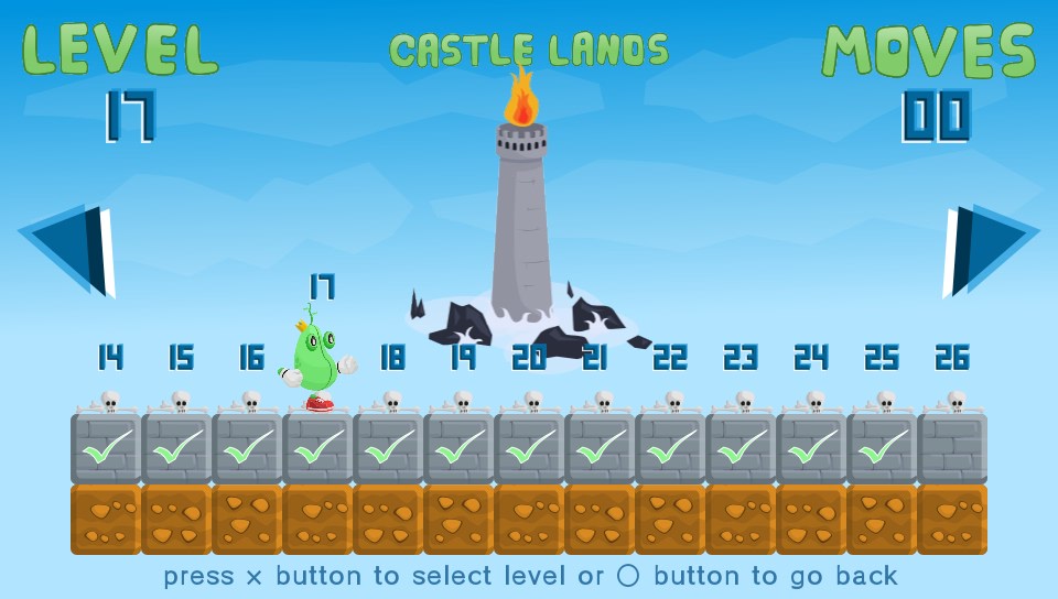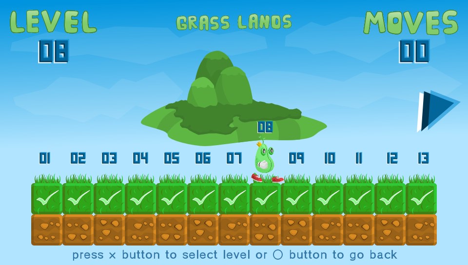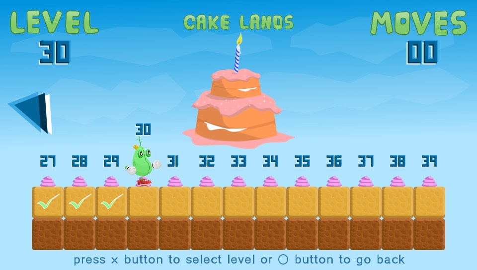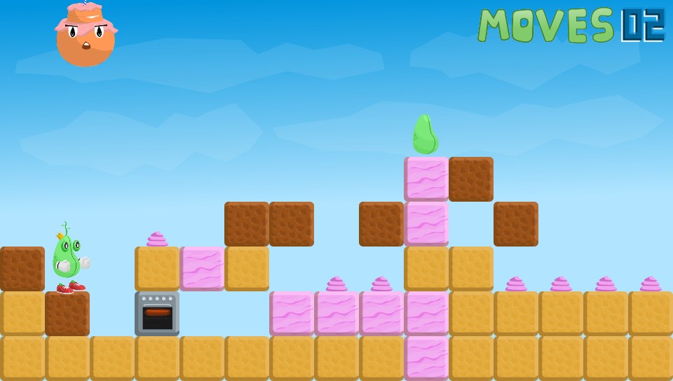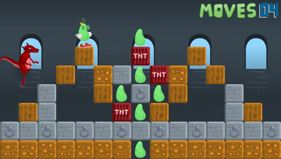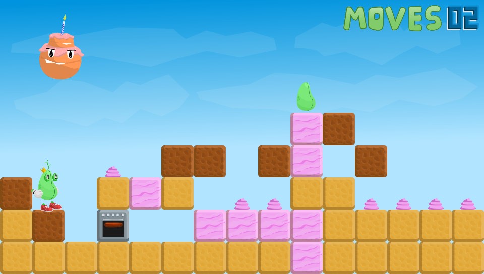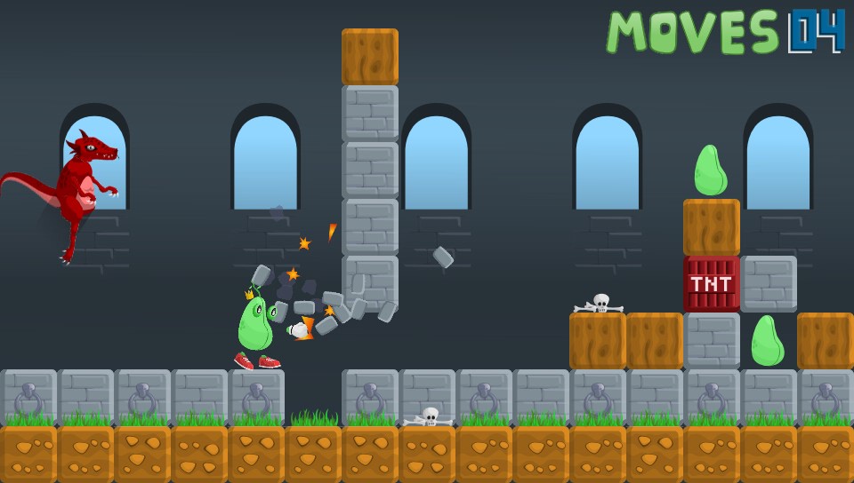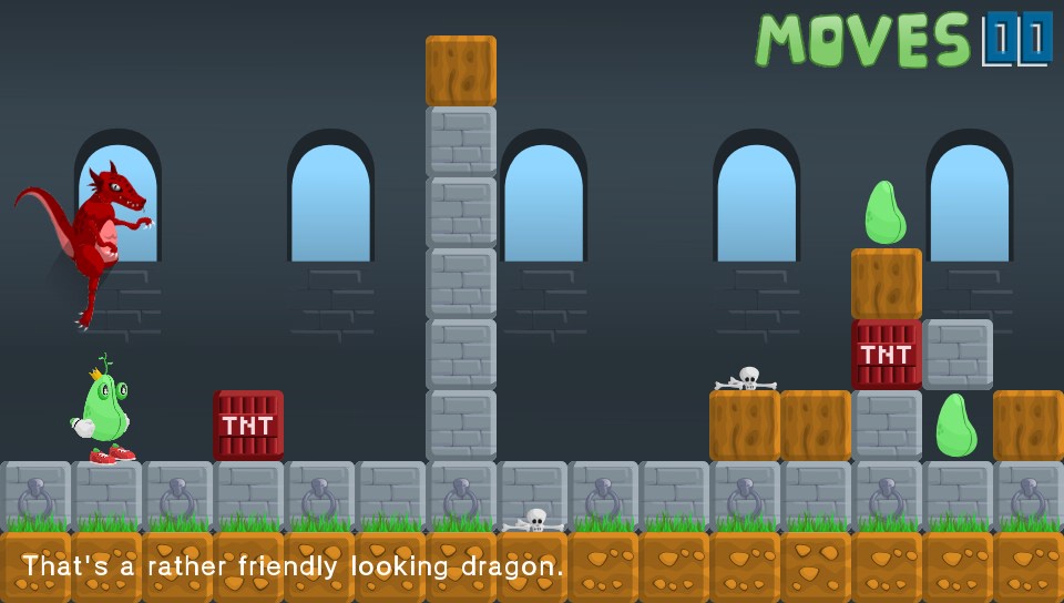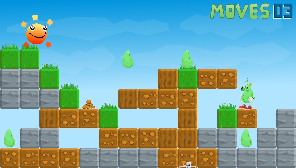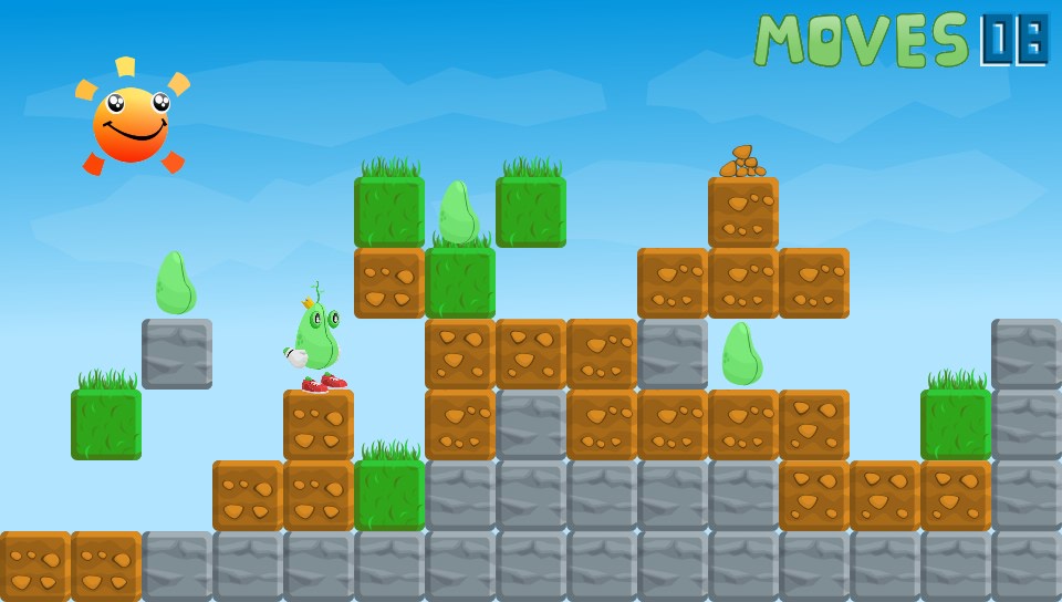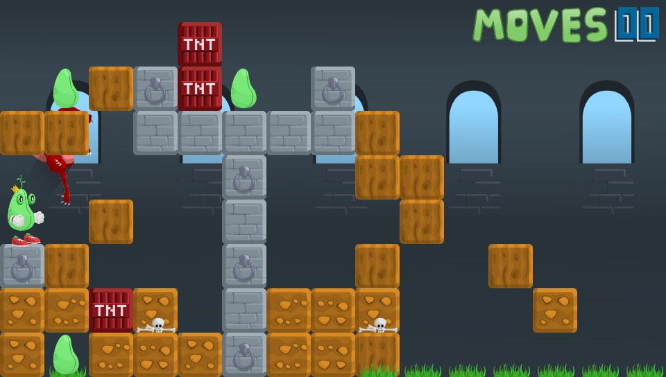You take on the role of a King… of sorts. Okay, you’re actually a bean(!) and you’ve lost all your other beans so you’ve got to go off in search of them. Why, I don’t know but it’s not really important, it’s not explained but my guess is that it won’t really make any bearing on the game. What is presented before you is a fun puzzler set over almost 40 levels where you have to manipuate blocks of grass, earth, rocks, wood, explosives, and even cakes(!) to reach the beans on each level before moving onto the next.
