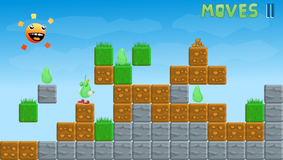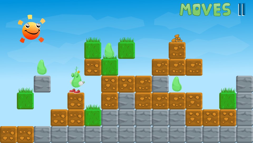 The game plays at a fairly relaxed pace with no time limit, so you have plenty of time to plan out what you’re going to do which is just as well… you’re going to need it! Each level is a single screen affair with the all of the beans placed in seemingly impossible to reach locations surrounded by different types of blocks. To get to the beans, you have to either move, destroy or climb over the blocks. There are several block types in the game, each with their own properties that have an effect on the game and how you interact with them. Grass blocks can be destroyed and moved but they disintegrate after moving a short distance, rocks can be moved and destroyed freely, and stone can’t be moved or destroyed. All of them can be climbed on easily enough but you can only climb up the height of a single block so you have to think before you move any blocks around so you can reach every bean.