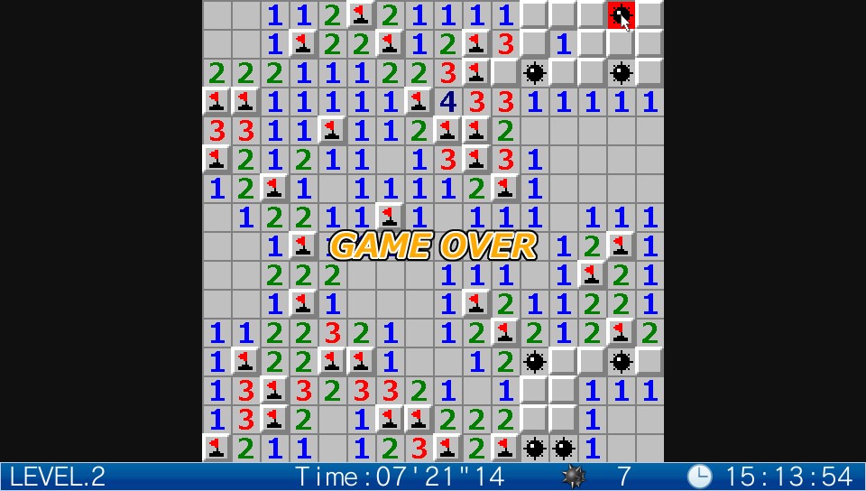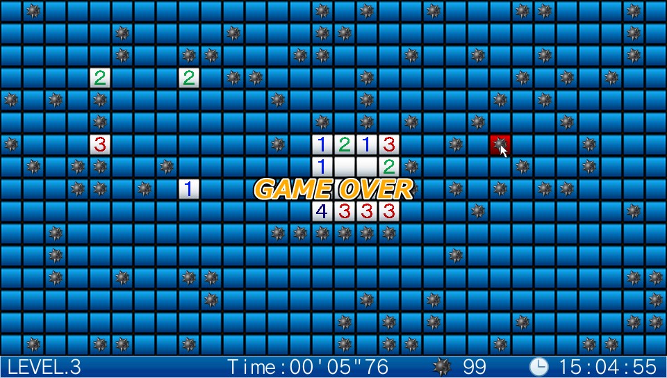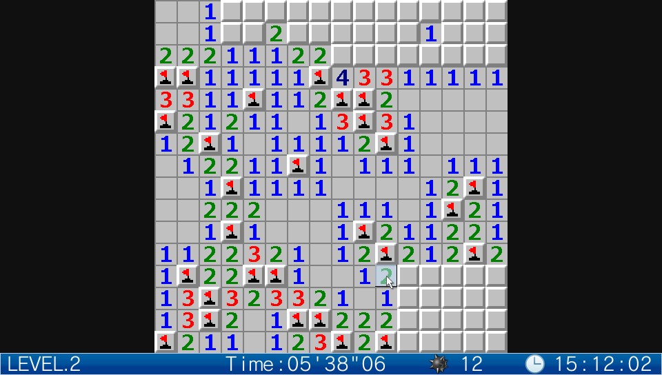 Once clicked it will display one of several things… If that square reveals a mine then it’s game over. If there’s no mine there and that space and several nearby are clear then a space on the playing area will be cleared from the screen. The final type of square that will be revealed will contain a number. These numbers represent the number of mines that this particular square is in contact with in adjacent squares. If a square has a 1 in it, then one nearby square (horizontally, vertically or diagonally) has a mine and all the other squares are clear. By looking at all the numbered squares you have to work out where all the mines are. If you identify where you believe a mine to be, you can place a “flag” on that square so you know not to click there. Flag up all the mines successfully and you’ve completed the level.