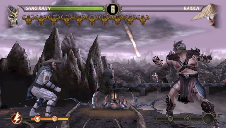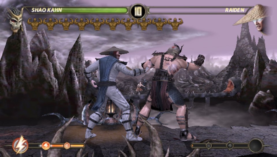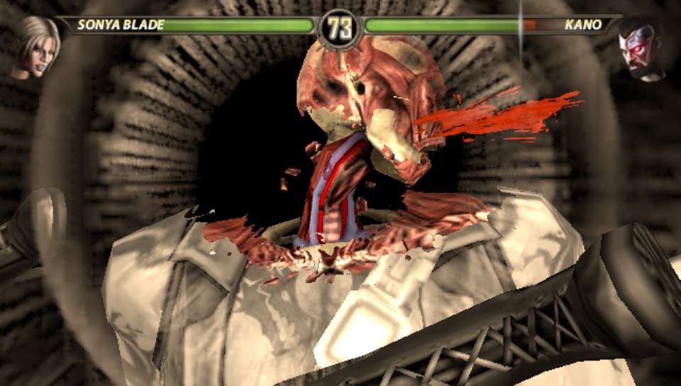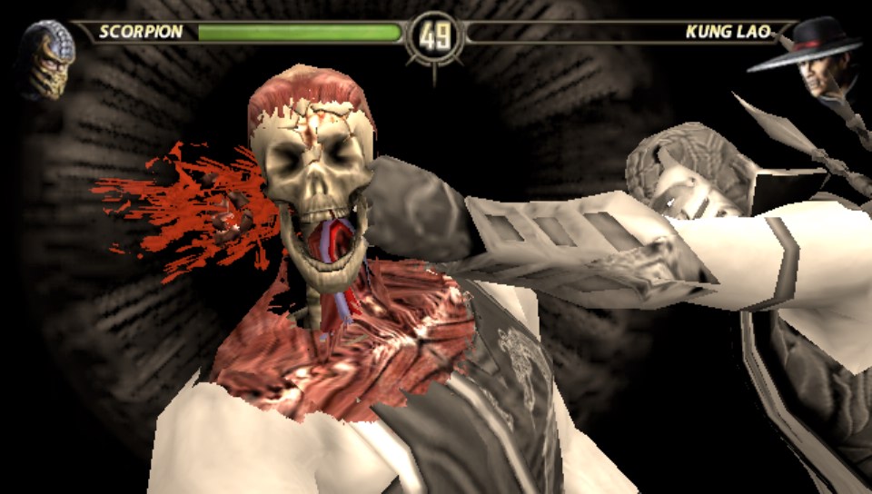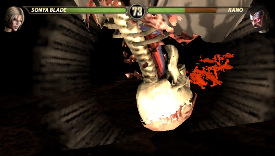 I shall not go into too much detail but along with fireballs, energy blasts, staff weapons there are plenty of weapons with blades and points resulting in plenty of claret all over the shop, all with the added zest of the exclaimation “Get Over Here!” as more gore hits the floor (along with the bodies). Oh, but the filling super bar at the bottom… what is that for, you ponder..? Once full, the term X-ray goads you into hitting your two shoulder buttons and an automatic combination of moves is implemented by your character. If you time it right, the distance is right and the opponent either is too dazed to notice or otherwise doesn’t block or dodge just at the right time, one of the combo points being landed just so initiates one of the move combos that the character is known for. Only this time, and unlike all the other games before it, you see the effect of the attack on the skeleton and internal organs of your poor victim, ahem, I mean, opponent due to an x-ray type view. Which is rather funny when you are sitting next to someone who is studying human physiology and they glance over at the right moment. Plus trust me, Johnny Cage dropping into his trademark splits to deliver a blow to his opponents gentleman’s area and implying the impacting of his crown jewels is the least eye watering of the vistas.