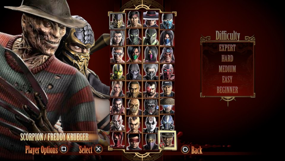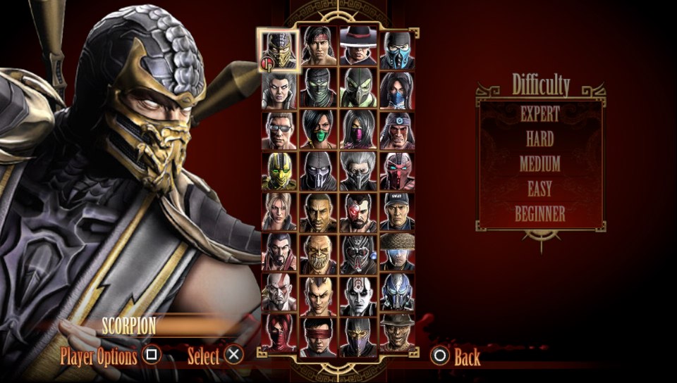 Luckily this isn’t actually based on the 2011 Mortal Kombat (9) release for the PS3, which had far more than 9 characaters. It’s more like the 2012 Komplete Edition as the DLC characters are included – those being Skarlet, Kenshi, Rain and Freddy Kruger (yes as in Nightmare on Elm Street Freddy). With the PlayStation exclusive Kratos playable character (as in God of War Kratos), the character rosta is a rather impressive, if not a little ridiculous, 32. Oh and they pretty much all have extra costumes, as you may expect.