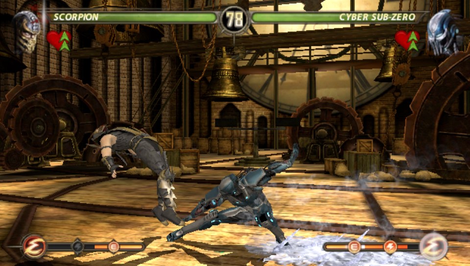 Of course there are other modes such as your usual Kombat Ladder (work your way up through characters beating them as you go) plus a Tag Ladder. Old school Test Your Might tower (repeated button press to power up and then unleash to break a pile of planks, bricks etc.) has been joined by Test Your Luck (a slot/fruit machine determines modifiers for a Kombat bout), Sight (ball and cup game… but with upper heads, minus the jaw for cups and eyeballs), and Strike (Test Your Might with accuracy – you activate the attack within a particular range of “might”).
