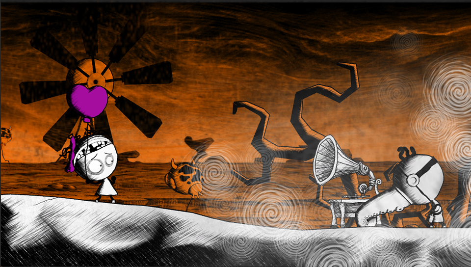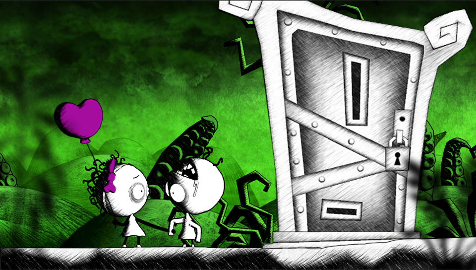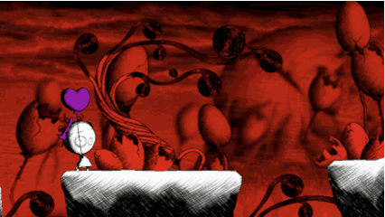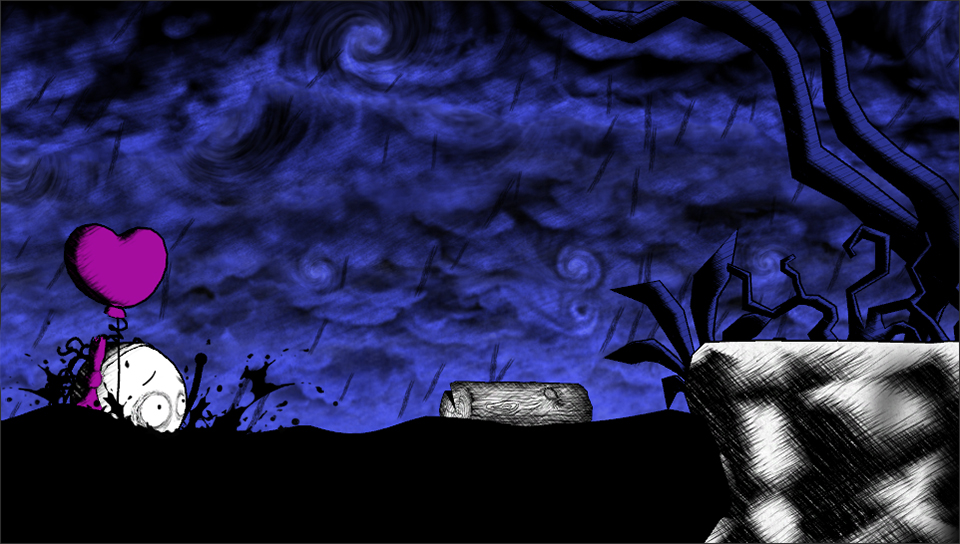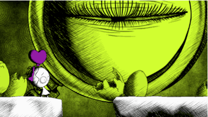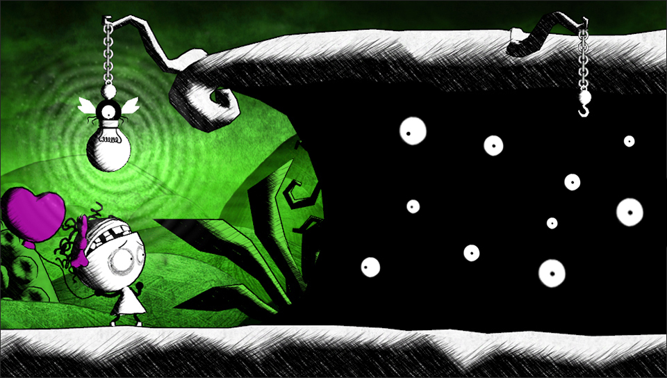 Murusaki Baby is spread across four distinct areas, each with environmental “mood” changes that interact with the game play that are switched between by swiping the rear touch panel, and in most cases have a game changing interactive effect to the story telling with a tap in the right place. Basic control is literally by leading Baby by the hand… you touch the screen to take her hand and then lead her through the levels. The further you extend her arm the faster she tries to walk/run, but pull her too hard and she trips over her own feet and ends up standing back up as she dusts herself off, and starts all over again with a little giggle, prompting your own sense of parenting to vow not to pull her to the floor once more. The child holds onto her heart which is a balloon on an all-too-easy to let go tether, which you must protect as much as Baby herself as spikes and even safety pin flies, that are anything but safe, threaten the little girl’s life. Burst that heart balloon and she’s done for, even in her amazing upside-down faced glory.