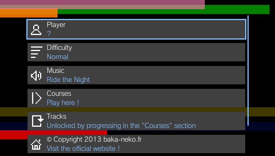 Following this is the Difficulty option, allowing you to choose from four difficulty settings from Very Easy to Hard with the game defaulting to Normal. Following that is the Music selection allowing you to alter the in-game music. Initially only one piece is available but more are unlocked as you progress through the game. The next two options, Courses and Tracks are the main part of the game and I’ll mention those in a moment. The final one is a web link to the author’s site.