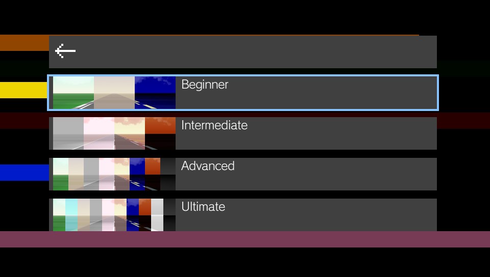 The two that feature the game itself are Courses and Tracks. In Courses you choose which of the four courses you want to race on and each of these is made up of a number of individual stages. You have a set amount of time to get to the end of each stage and if you manage it your time is extended and – as you can probably guess – you’re then up against the clock to get to the end of the next stage. Each stage has a different look to the one before it and while the visuals mainly consist of a plain road and gradient backgrounds, the stages look different enough to keep things varied and things move along at a breakneck pace to give you a fantastic feeling of speed.
