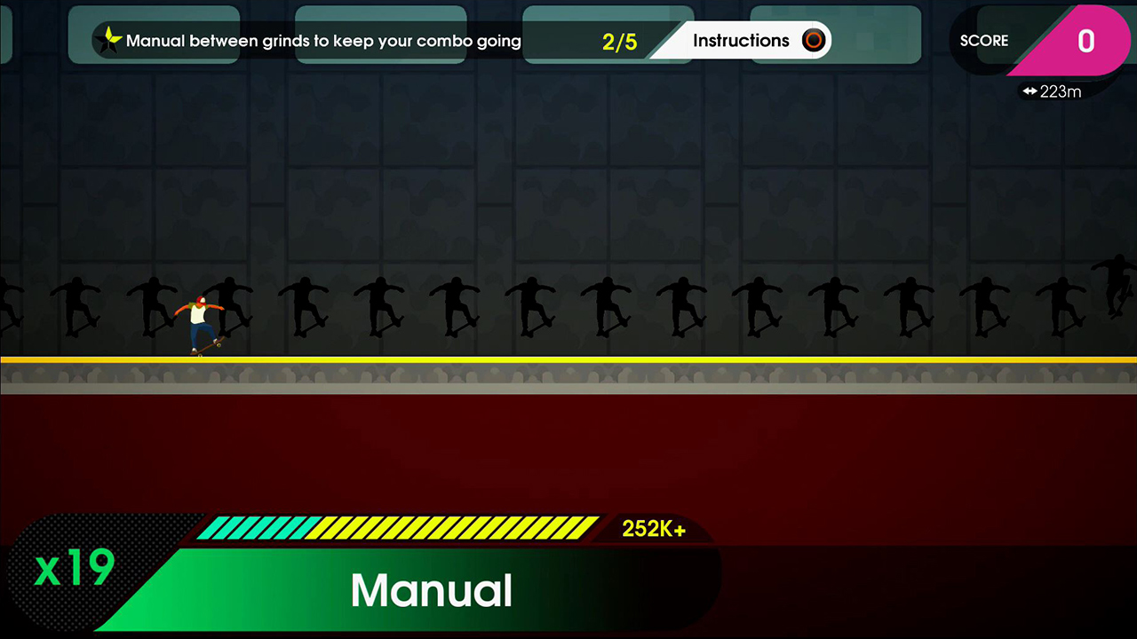 The ‘hook’, aside from the desire to complete challenges, is that when you get it right in OlliOlli 2, you really get it right. The game has introduced the ‘manual’ which you can execute by using the left stick along with ‘X’ when you land, and means that in the majority of cases it is possible, nay desirable, to combine all of your moves into one ‘super-combo’ that stretches the entire level. It is possible to generate good scores just by doing this, and executing so-called ‘perfect’ landings (achieved by pressing the button very near to the place of landing / grinding, get it right and your skateboard will glow green briefly along with a small speed boost).