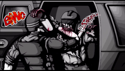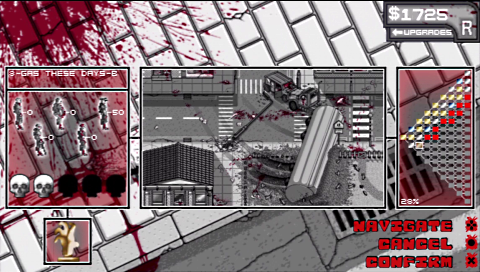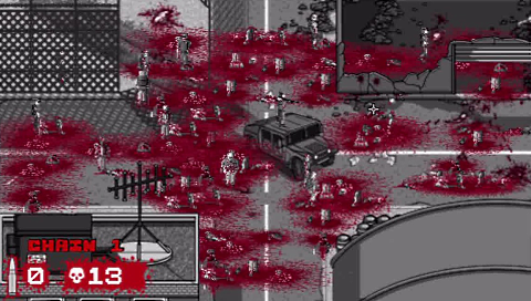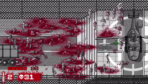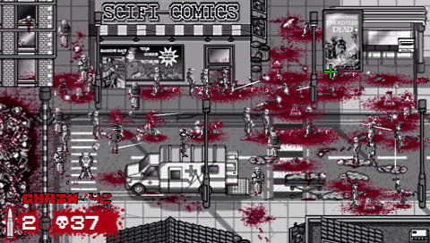 The overall style of the game is monochrome, which is again very different from the norm and is reminiscent of old zombie film classics like Night of the Living Dead. The soundtrack is very subtle, with much of the noise made by the zombies themselves! The controls are very simple even for a Minis title! You control your aiming reticule with either analogue stick or the D-pad and you fire with the X button. You are able to use the L and R shoulder buttons to see zombies health or what type of zombie they are, using a colour coded scheme.