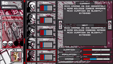 Your end of level score is determined by how many zombies you are able to clear from the arena. You can obtain any of four trophies ranging from bronze through to platinum (not trophies in the PlayStation Network sense, just within the game itself – Ed) and each trophy also comes with money which can be spent in the upgrade shop. The upgrade shop is, unlike some games, essential to you progression through the game and you will be using it at every opportunity to upgrade you ammo capacity, damage and other benefits.