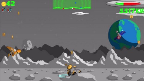 You first attempt to launch your craft with what looks like a large cannon. A gauge is used to determine the angle and speed of your launch and when you are in the air the only control you have over your ship is again pressing the X button to give you a slight lift. This is limited so you will crash land at some point – it’s just a case of when! You are able to prolong your orbit by upgrading your ship and launcher. Your task is made more difficult by the amount of obstacles that litter your path, these can range from space junk to satellites and rocks. You will need to navigate around these otherwise your journey ends rather quickly.