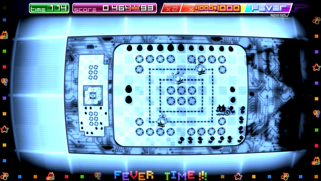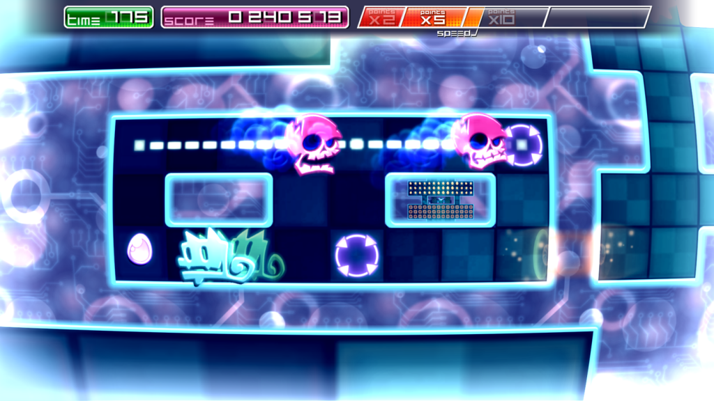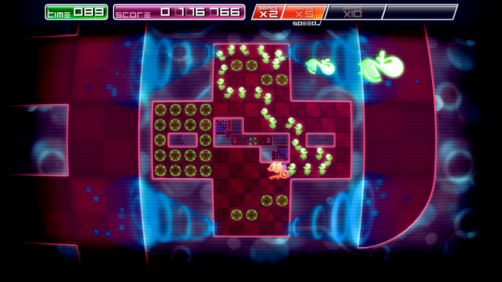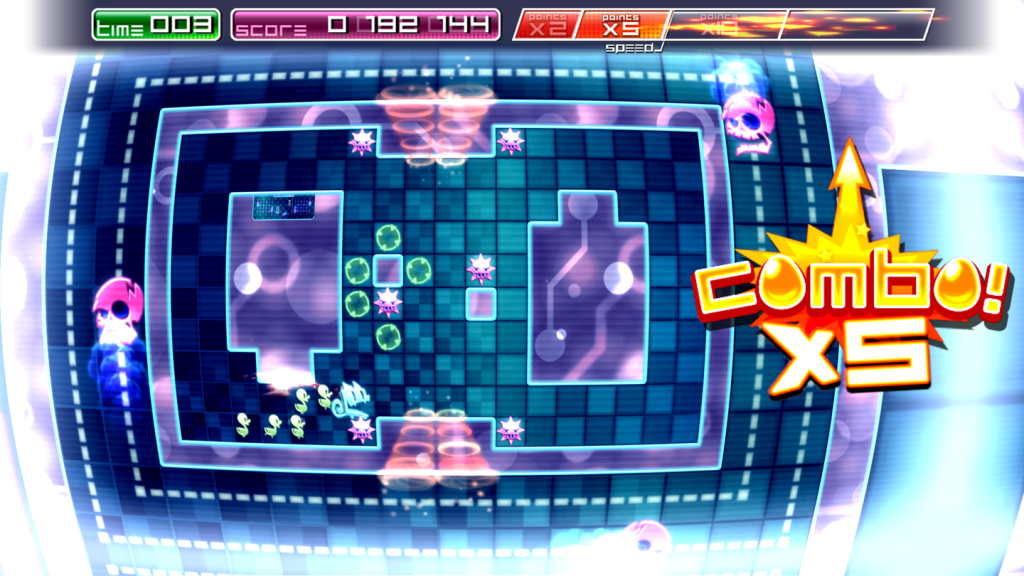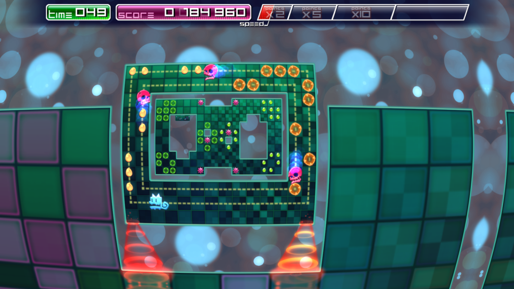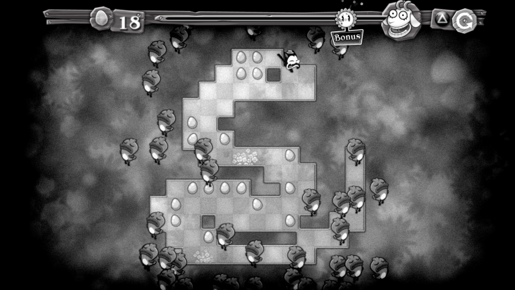 Changing levels introduces one of Pix’s most interesting dynamics, although the fundamentals are mainly visual, at the start at least. Pix inhabits an “infinite maze”. When a level is finished an exit opens up in the maze he is currently in, and Pix can jump up or down to the next level, achieved using a dramatic visual effect. As you play through the game, this becomes more than just a visual aid but an actual mechanic of the game. Pix will jump in and of exits in order to collect the maximum amount of eggs, and maintain combos.
