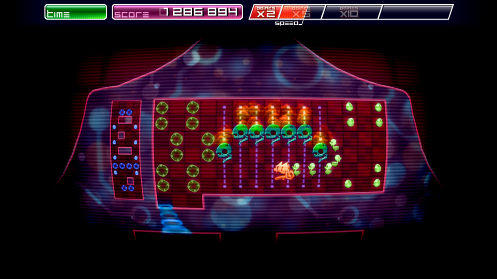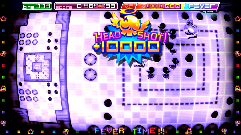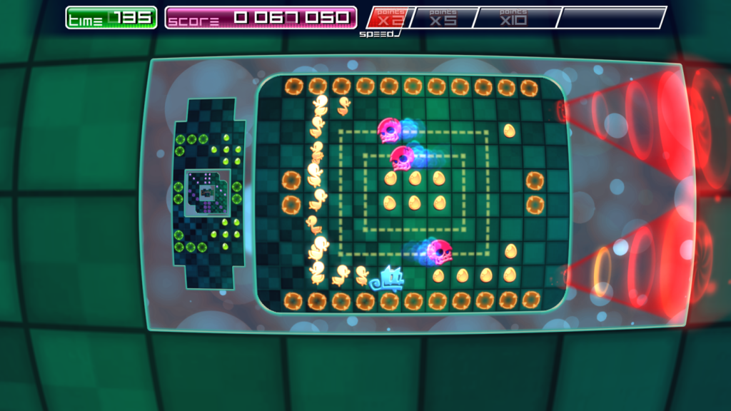 Visually, the graphics are simple, clear, bright and full of that neon quasi-retro arcade feel that the likes of Geometry Wars etc. have. Each screen shows a maze of sorts, with eggs and the “holes” for the ducks to fall into. These and your main character are clear, and clearly marked.