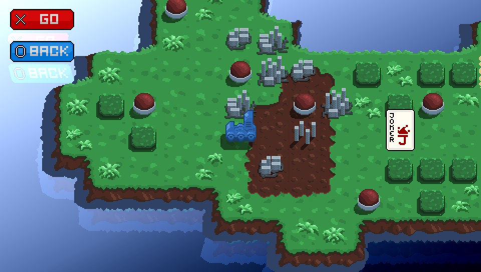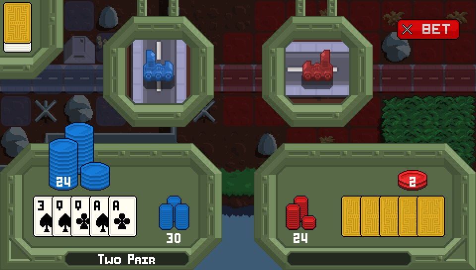 Here, you see an overview of your squad and the opposing side, each taking turns to move individual units. Each turn follows a set phase split into three elements – movement (with each tank having a set range), direction (enabling you to decide which direction you tank faces for attacking) and the attack itself. If you decide to attack an opponent, rather than using attack / defensive / damage scoring that you would expect, the game changes again to a poker sub-game. Each tank’s health is represented by a number of poker chips and you have to bet these against the CPU in a hand of 5-card poker. If you win, then the CPU’s tank loses the number of chips in the pot from their “chip health”. Once a tank runs out of chips, they are destroyed and removed from the battle. This continues until one side has lost all of their tanks.