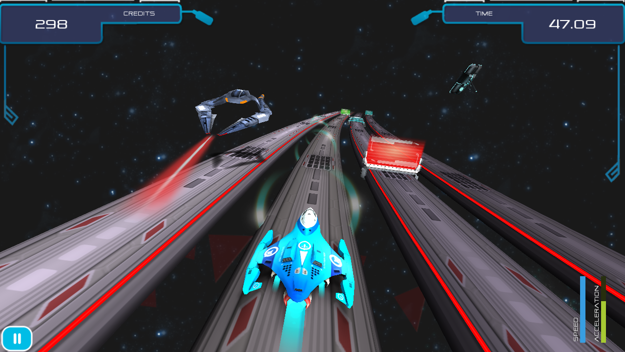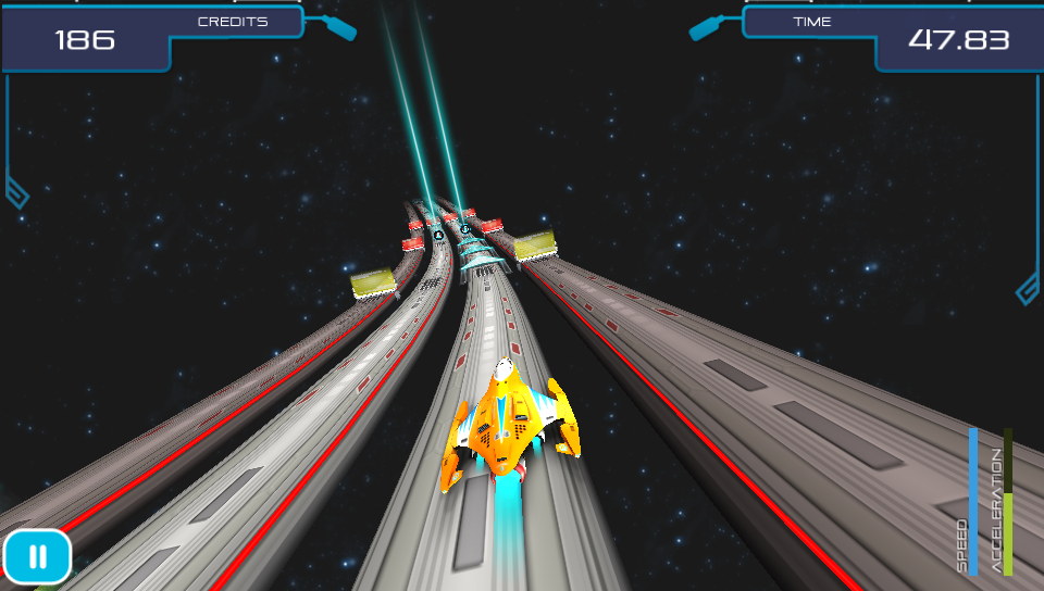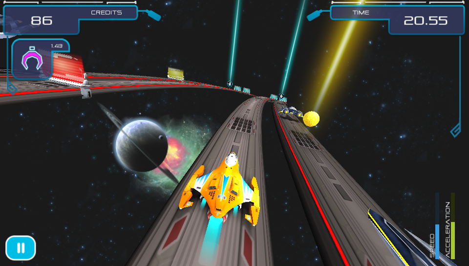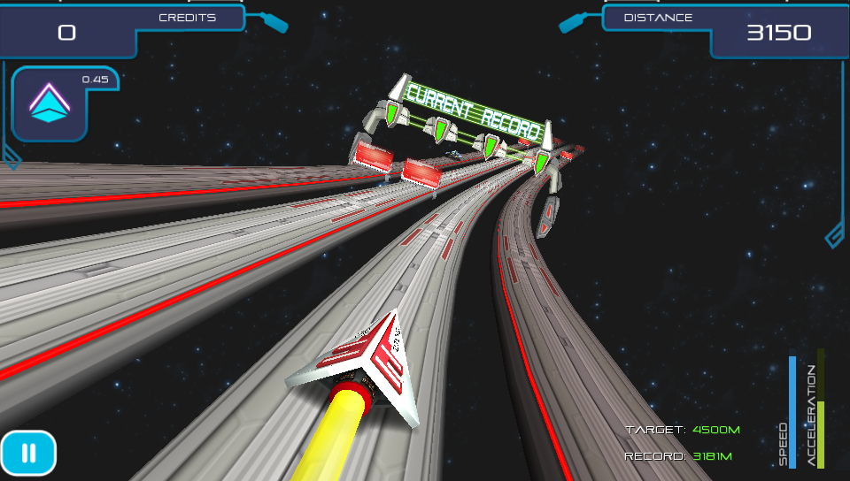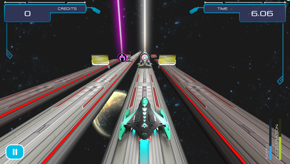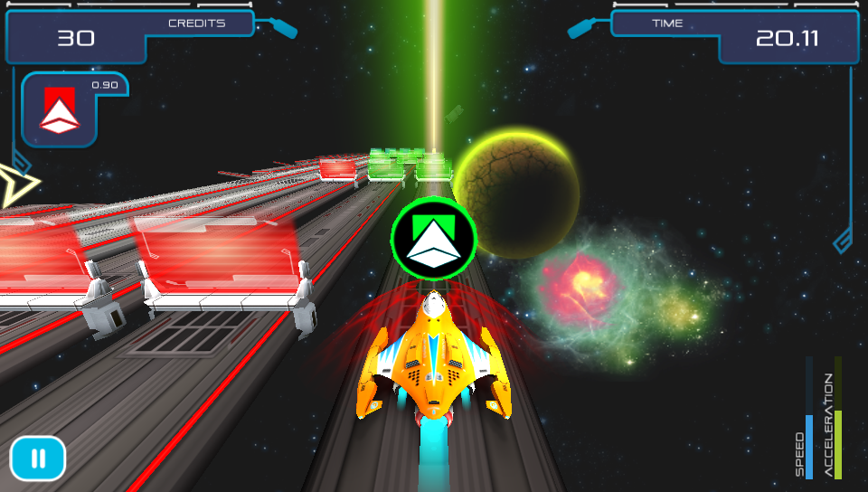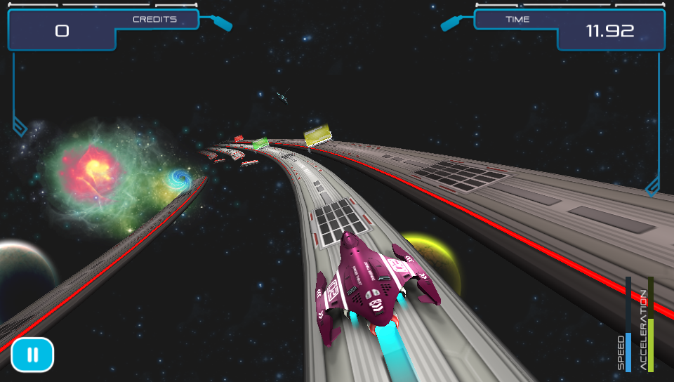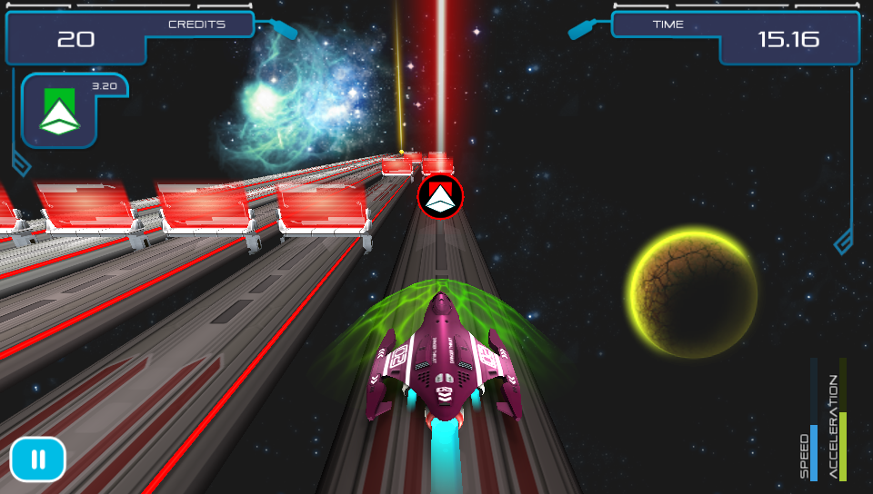 The game starts off gently teaching you the basics of the game from switching lanes, collecting credits, avoiding barriers to using power-ups that you will find on the track in later levels. As new elements are added to the tracks as you progress through the game you are never left to figure things out for yourself as there is always a brief explanationat the start ensuring that you are able to focus on playing the game rather than struggling to figure out what to do. As well as the standard levels, which increase in difficulty as you progress through the game, there are bonus challenge levels where you can earn extra credits by replaying planets in special missions where you have to reach fixed distances without crashing. On the earlier levels this isn’t too difficult, but as your ship speeds up the further you travel on these later levels things get pretty tough!