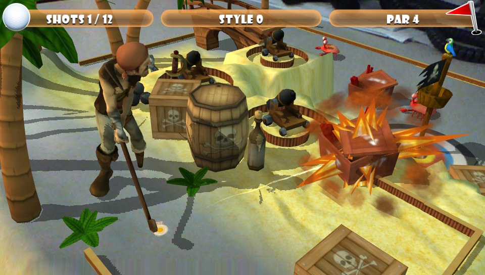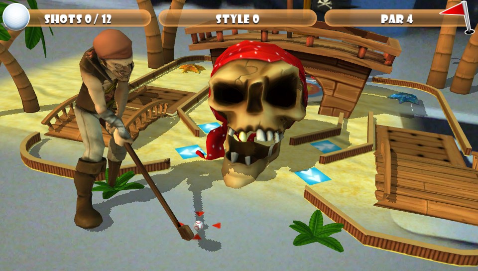 There are various challenges that provide between one and three stars upon completion that increases your level much in the same way as the levelling up system in the platformer Jetpack Joyride with a pop up menu on the left of the main menu screen informing you of the next three challenges, which is also available from the pause menu and a name for each level, such as beginner golfer for level two. There are three characters to choose from including: the countess (a female vampire), captain pegleg (a male pirate) and star commander (a spaceman) with the ability to customise your player name within a limit of seven characters. The club house is effectively a huge trophy cabinet spread across four screens showcasing trophies for all of the tournaments that you have won, challenges that you have beaten and levels that you have reached across the six themed courses and informing you as to the requirements that need to be met for each of the trophies. The stats screen displays all of your statistics spread across five separate categories: player, tournament, holes, challenges and style points. The statistics range from total play time, longest play session and characters used through to the amount of tournaments won, best tournament score, holes under par, ball distance covered, global challenges completed, stars earned, most stylish hole and much more.