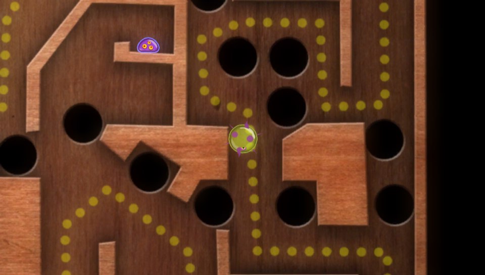 The Tilt-A-Blob levels are viewed from a top down perspective as you attempt to avoid various circular pitfalls in order to successfully navigate your way through a complex maze. There are other mutant blobs that you have to rescue along the way ranging from one to two mutant blobs spread out across each of the twenty-nine levels and successfully finding them will definitely improve your score for that particular level. You will be rewarded with a bronze, silver or gold medal based upon your overall score and if you have successfully rescued all of your blob friends for each level. Upon selecting a level, you are provided with a menu detailing the level number, the name of the level, your best score, the amount of blob friends that you have successfully rescued and your ranking score on the online leaderboards, which provides you with key information on where you need to improve your performance within that level in order to achieve a higher medal and score, such as not having rescued all of your blob friends. As a reward for completing each chapter; there are unlockable cut scenes that when unlocked can be watched at anytime. There are eight cut scenes in total including the intro, chapters one through five, credits and epilogue.