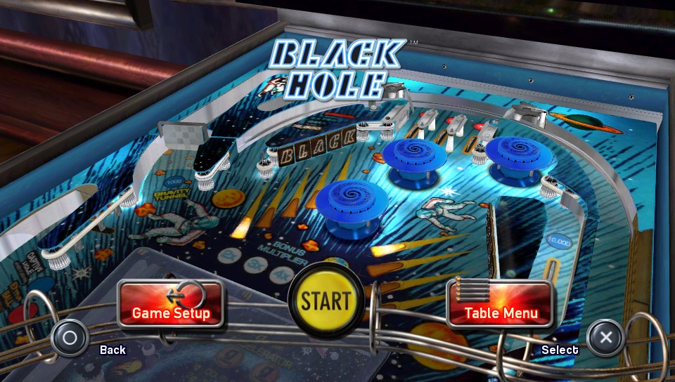 So looking at them in turn, Black Hole is the oldest of the four and is a table from Gottlieb dating back to 1981. It’s a sci-fi themed table and is one of the more unusual pinball tables available because it offers a dual playfield. During play, you can activate a secondary play area located underneath the main table visible through a transparent panel. My main issue with this is that it is an incredibly difficult and frustrating table to play. Whether it was just me or the table design itself I don’t know but I found games to be incredibly short and there were instances where I barely had the chance to touch the ball before it went out of play. I guess that this is one of those tables where you NEED to use the nudge function to even have a chance to play it for more than a few moments. Not the best start I am afraid.