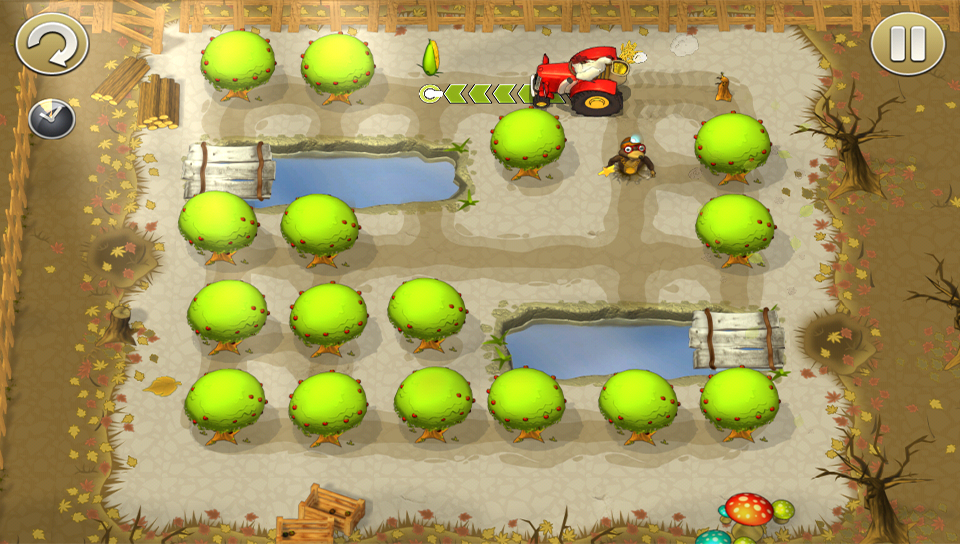 You have 3 goals that, when fulfilled, offer you stars that are used to unlock more fields for you to tackle, with there being a total of 130 fields for you to farm. Stars are not the only thing that you will be collecting on your journey, Corn can be picked up as you tractor around and this corn is stored and can then be used in the shop. The shop has items and upgrades for Red that will help you, particularly in the later levels and range from hints to Undo’s and Pausing time. These items can be bought as many times as you need as long as you have the corn for them. Upgrades to Red though include the ability to queue moves, move faster and the ability to hold more help items per level.