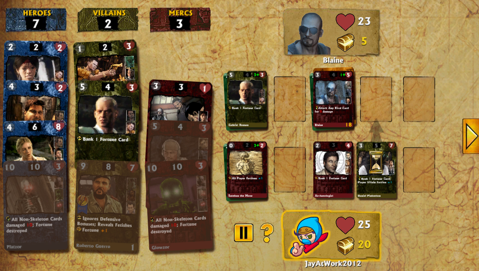 In Fight For Fortune, you take on a series of characters from the Uncharted series (or human players) using a deck of cards that you can create yourself or a randomly constructed set of cards. Taking it in turns you select a character card (chosen from heroes, villains or mercenaries each with their own strengths, weaknesses and abilities that affect gameplay). These are used to attack your opponent or their characters depending on where you place them on the five character slots on the game board. You then draw a random fortune card providing you with an item of treasure. These can be cashed in to build up your resources or assigned to a character to be cashed in later for greater value.