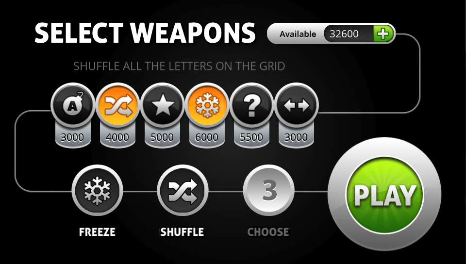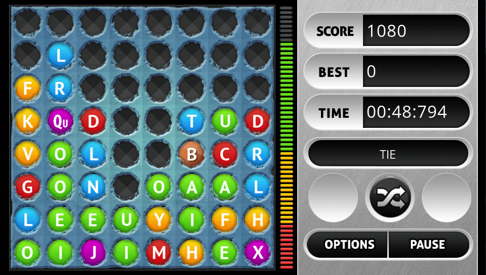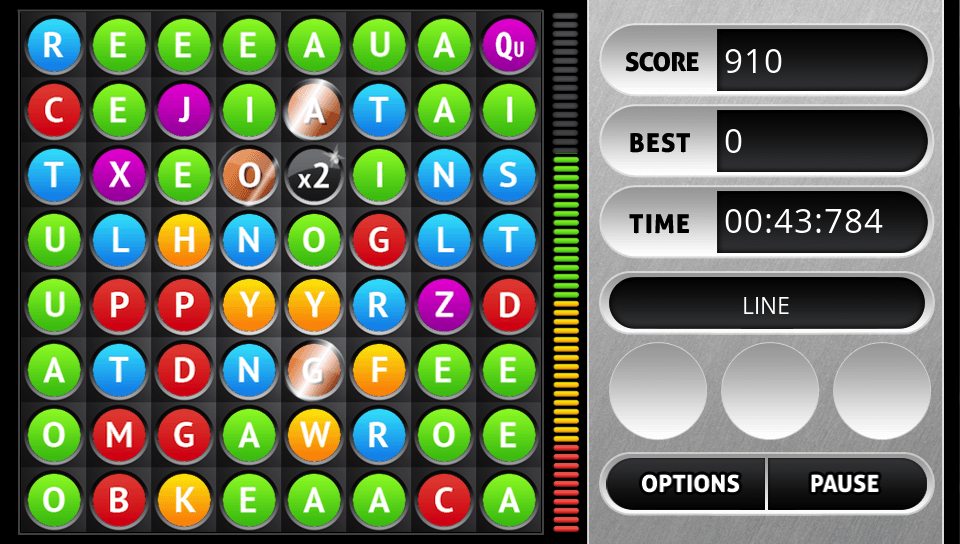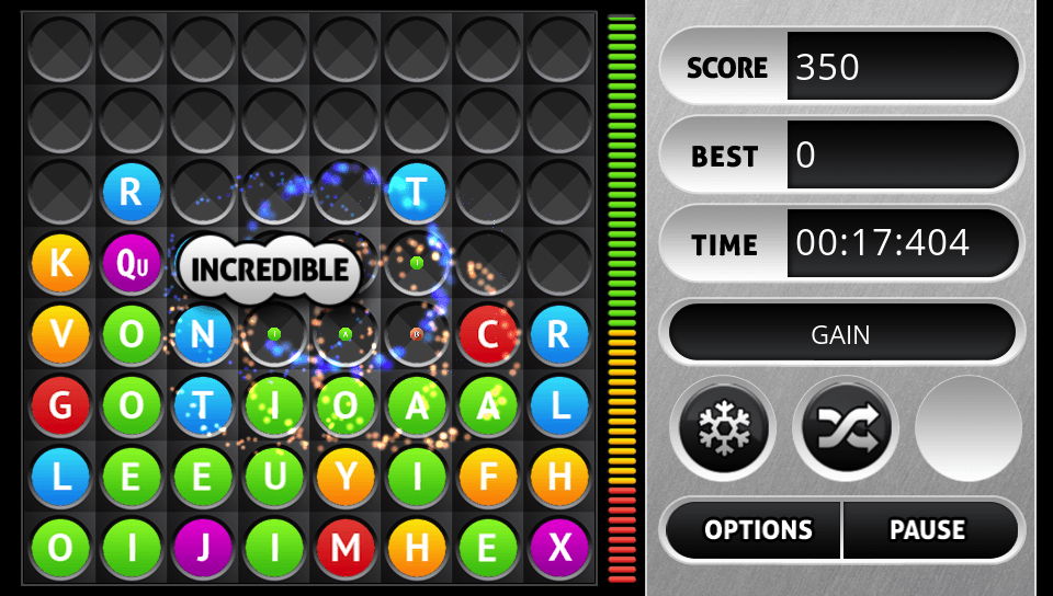 Sounds simple? It would be if it wasn’t for one thing… While you are trying to find words on the grid, more balls are dropping down all the time, slowly at first but increasing in speed as the game progresses. Once the balls reach the top of the screen it’s game over so you need to keep clearing balls as fast as you can. Help is on hand through the use of special weapons that you can use during the game to destroy balls, swap letters around and more and these can be purchased using coins that you earn playing the game… and that’s pretty much the basics in a nutshell!