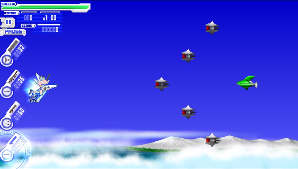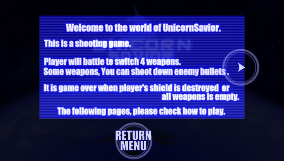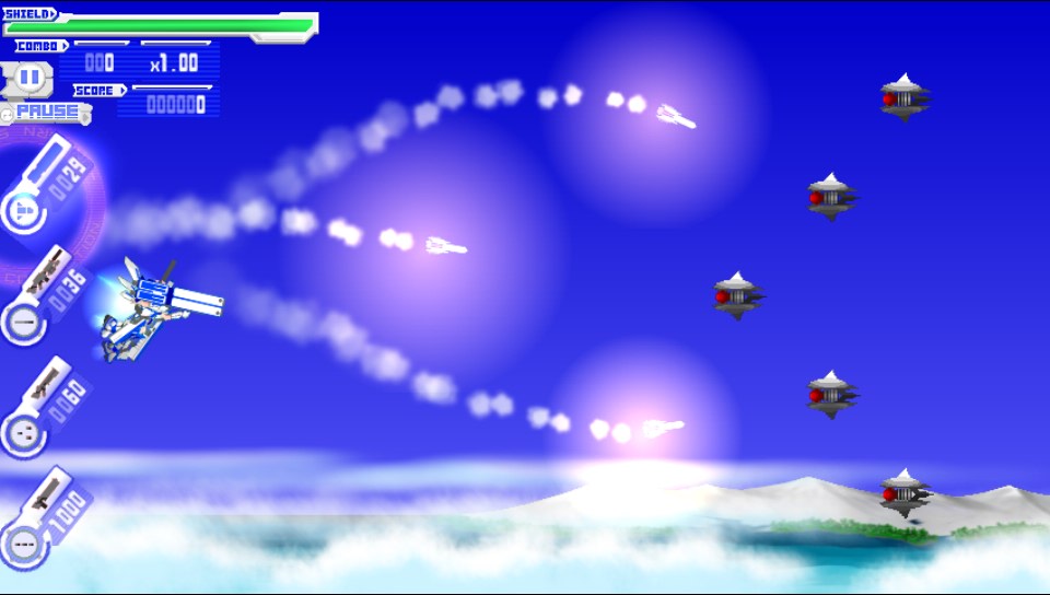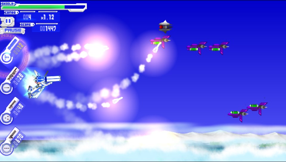 So then on to the actual game which consists of your character flying through levels, taking down waves of enemies of all shapes and sizes and finally taking down a rather large end of level boss. Sound familiar? Then I shall throw you a couple of curve balls. First off your character does not move around the screen at all! Your character stays completely stationary on the left hand side of the screen as the level plays out before you. Secondly you control your weapons by touching the part of the screen you wish to shoot at, simply tap or hold for a lock on an enemy and you fire your currently selected weapon. There are 4 weapons for you to choose from and they are equipped by tapping the relevant icon on the very left of the screen. You have access to a machine gun, shotgun, sniper rifle and homing missiles. Each weapon can be utilised for different situations to help you on your journey but you do have limited ammo for each and there are no power ups of any sort so weapon management is critical to your success. Because you cannot move your character it is essential to try to eliminate your foes as quickly as possible and learning the patterns that emerge, you are able to shoot projectiles out of your path with the correct weapon which helps to negate the fact that your character does not move out of their way. This will mostly be familiar territory for any veteran gamer. End of level bosses are just as you would expect. Big, Bad and with weak spots that shine like beacons. Each boss has a slightly different tactic to defeating it and again it is simply learning the attack patterns that will get you the best results and this is where Unicorn Saviours longevity will come from and this will vary from player to player.
