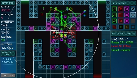 The only real drawback with this game is that it’s a port. While that’s not something that would normally bother me at all, in this particular case Vector TD is a port of a free web-based Flash game. The question you have to ask yourself is whether it’s worth paying a couple of pounds for a game that you can carry everywhere with you and play any time you like rather than having to play it on a best laptop for gaming or desktop PC. I have noticed slowdown issues with the Flash version of the game when things get extremely busy on-screen, there’s no advertising and it loads almost instantly (whereas the Flash version has pauses while each map loads in) in so there’s no denying that the Minis version is superior, but if cost is a factor for you then that may be something that would put you off.