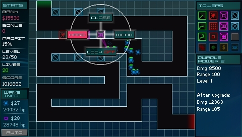 On screen, you can see the power and range displayed for each unit that you have once you select them as well the strength of each adversary in the upcoming attack waves. As you upgrade each tower you will see these increase to their maximum potential and again, choosing which towers to upgrade during what attack wave is key to completing each map. Different towers are more effecting against some types of aliens than others so having a balance is critical.