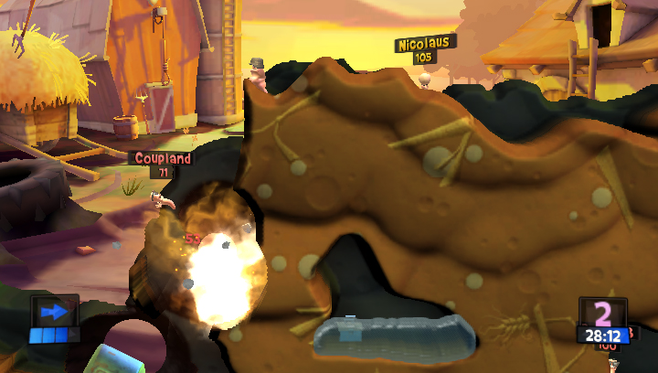 The missions are spread over several themes – Sewer, Farmyard, Spooky and Beach form the initial game with the DLC packs giving the Mars, Funfair and Medievil missions. There is online multiplayer, as you may expect, local multiplayer (using ad-hoc network) is missing, so hopefully that is but an update away. Having said that there is the “other” local multiplayer option of passing the machine around using the deathmatch, forts or classic game styles in versus mode, which, of course, suits a handheld down to the ground, and makes me wonder if pass the machine multiplayer turn based strategy games like Civilization might be viable with the umph of the Vita, but I digress.