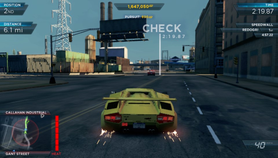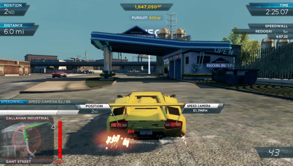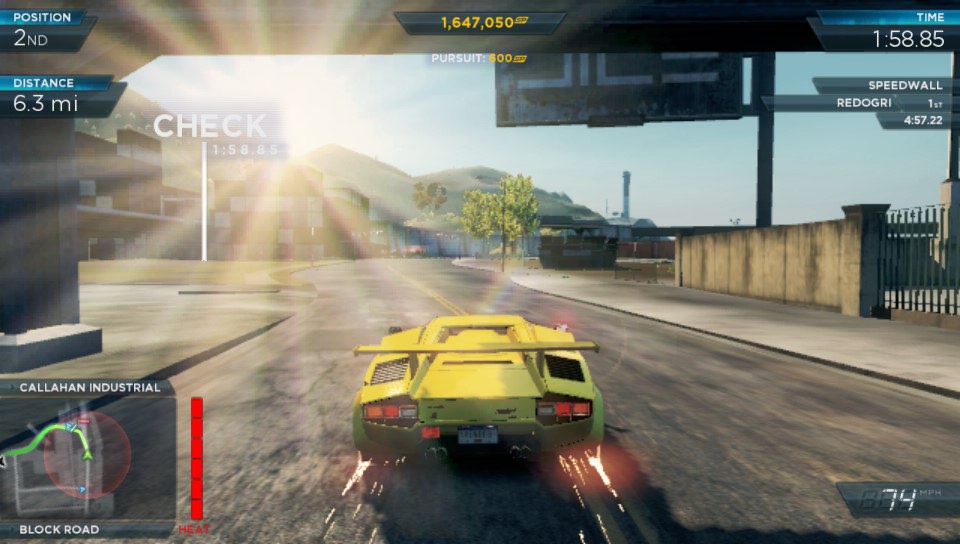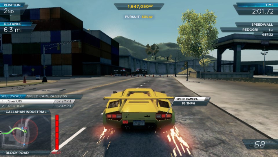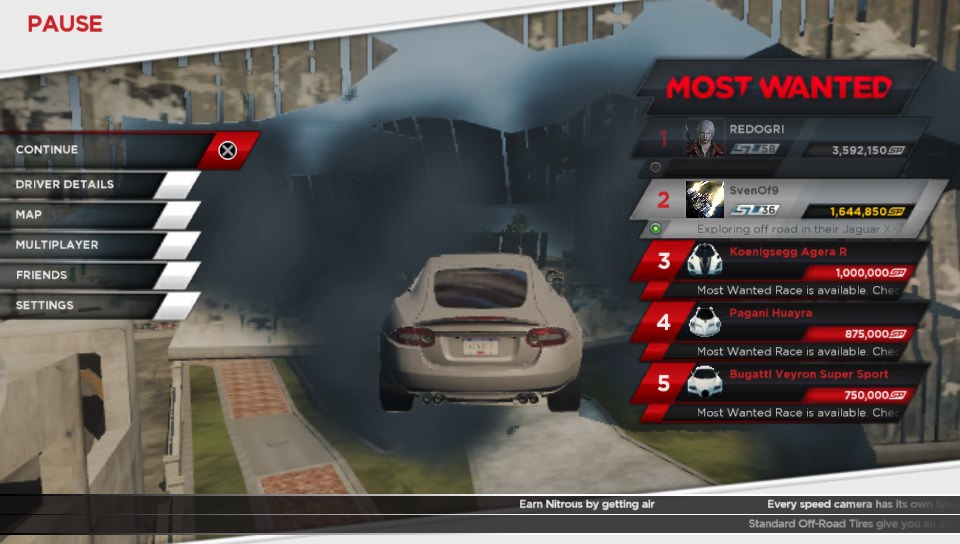 By winning races you earn vehicle upgrades as well as speed points which you can also gain from escaping cops when a pursuit kicks in (either by you being clocked at too high a speed or by hitting a police car), smashing through billboards, breaking down security gates or triggering speed cameras. This then unlocks races to take down the ten most wanted cars which you have to beat in a race and then destroy to add them to your car collection. Further cars are also unlocked by finding them which pops an icon on the in-game map. Different cars can be used in different races so finding all the cars and thus accessing all the races gives you a better chance or earning more speed points. Every car handles differently and very slight tweaks do come into play with every tyre, chassis and engine upgrade, but even the twitchiest handling car or non-cornering beast can be gotten used to, to win races and further points.