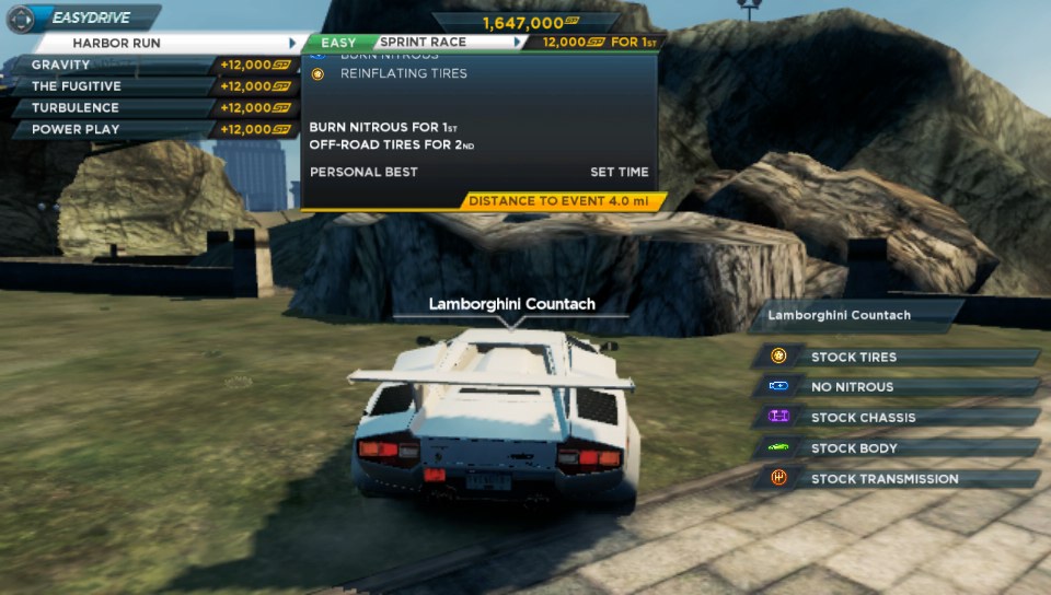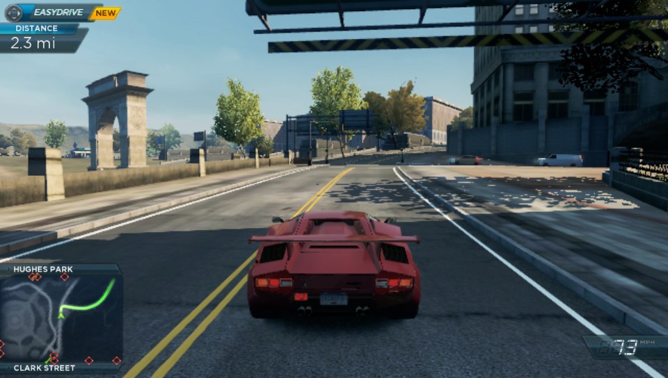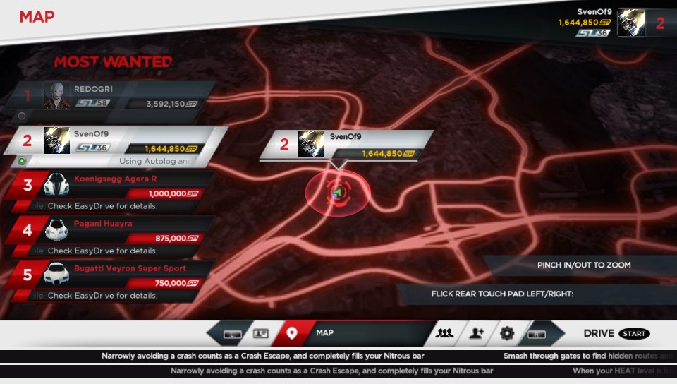 Most Wanted is presented as a fully open world, with you being presented with your first car, an Aston Martin V12 Vantage, with you already at the wheel being guided to your first jack point where you pick up a Porsche. The tutorial guides you to the first event for the Porsche and you are away. Access to events is by driving to their starting points (though, unlike the initial release of Burnout Paradise you can restart a race from within it or just after it’s finished, via a pop up menu) and you are thus encouraged to explore the game map to find all of the events. As you play AutoLog (upgraded since it’s appearance in previous games) which is essentially integrated completely with Easydrive – the side HUD menu system, issues you with suggested challenges/races as well as challenges from players on your PSN friend list.